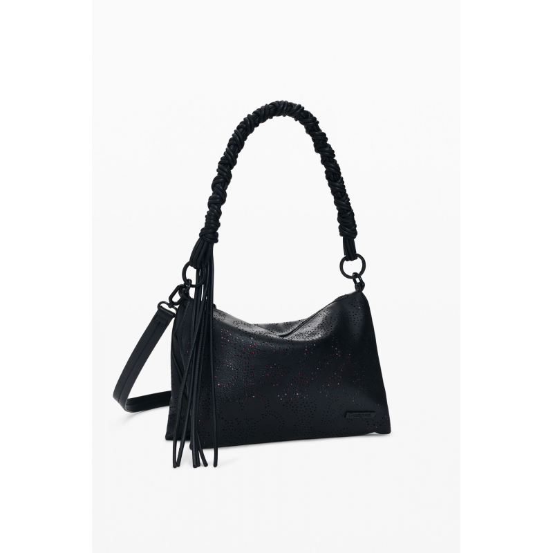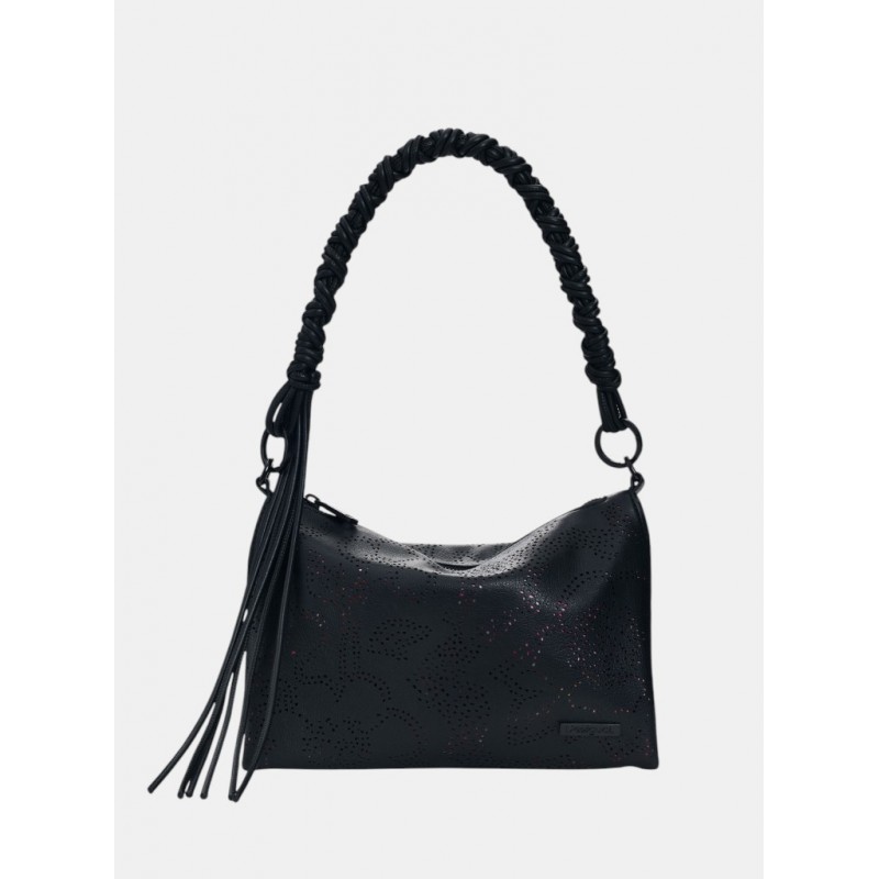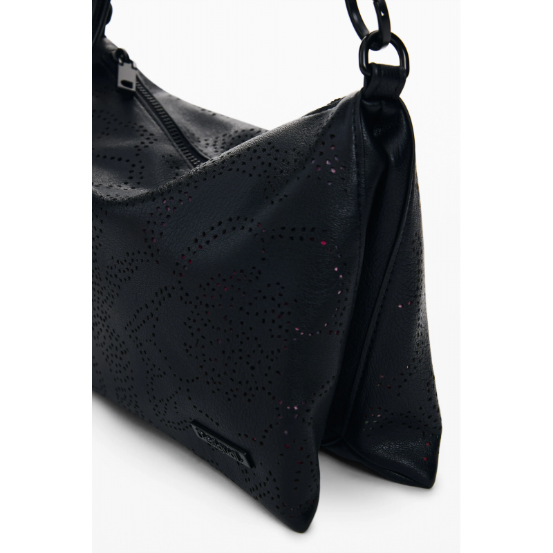 Bolso mediano para mujer de cierre principal con cremallera, diseño troquelado con estampado de flores, detalles de la marca, bolsillos interiores y doble correa una trenzada y otra extraíble para llevar tipo bandolera,