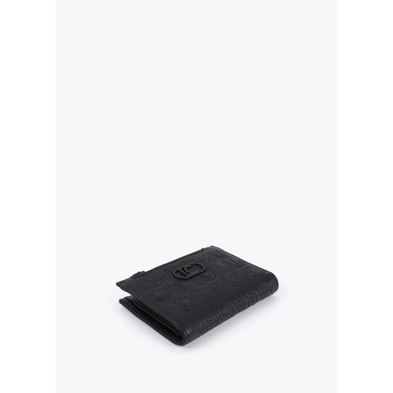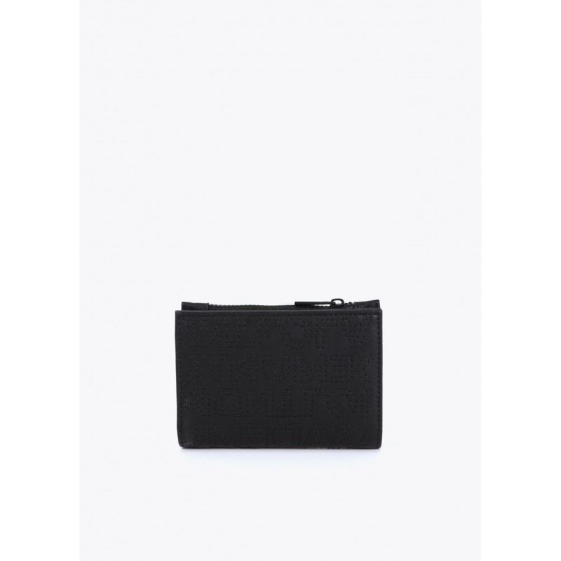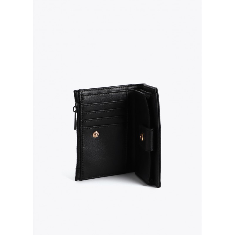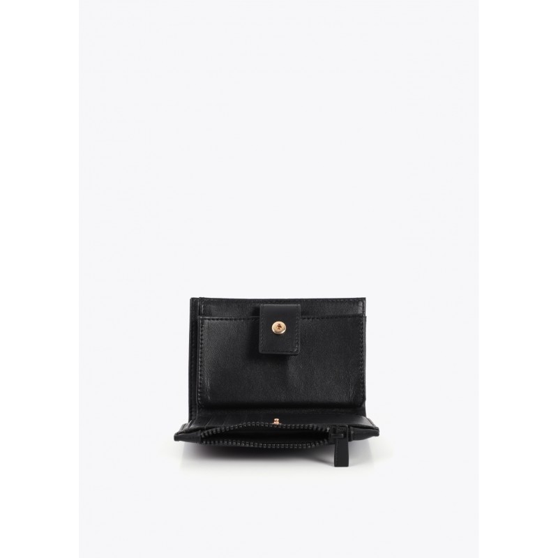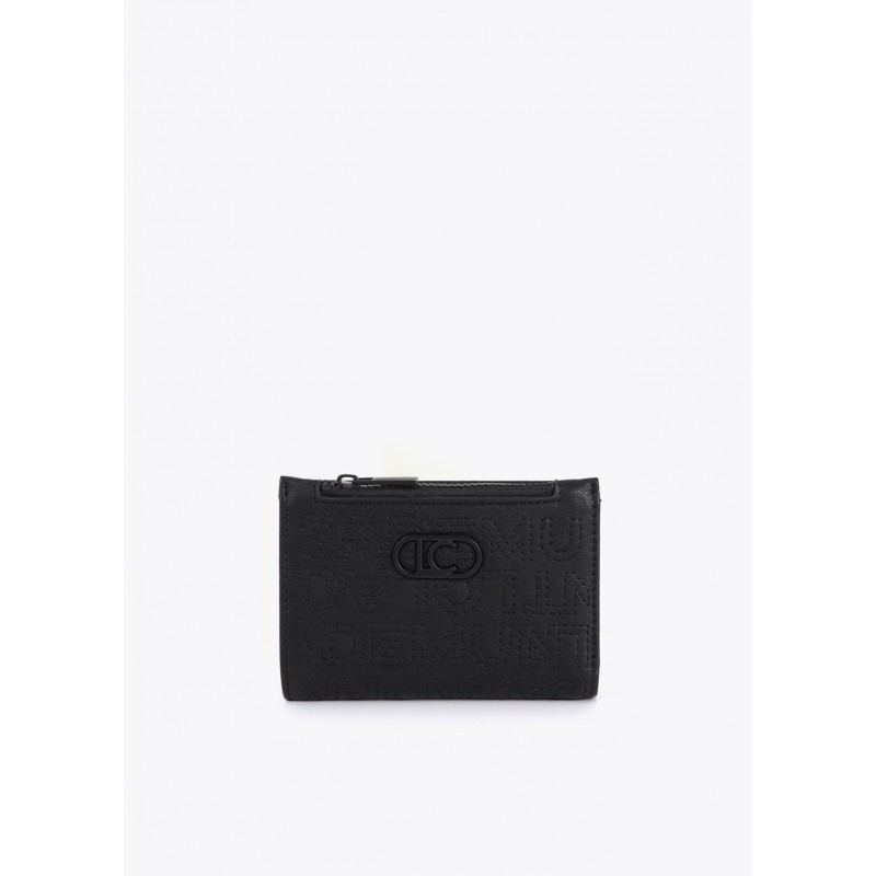 Monedero elegante de color negro con pespuntes que forman el logo icónico. Diseño compacto y funcional con varios compartimentos internos. Detalles metálicos en tono dorado y cierre seguro con cremallera. Ideal para llevar tus esenciales con estilo.