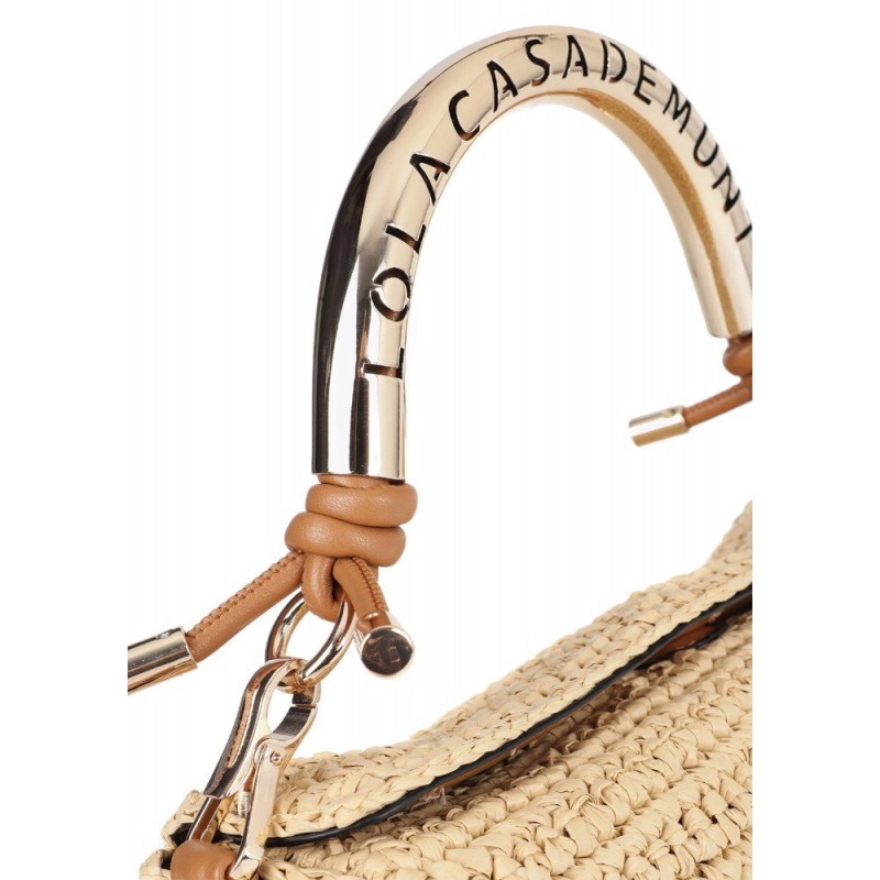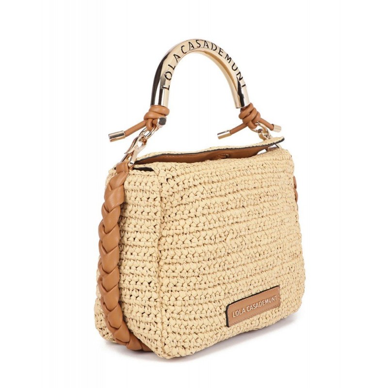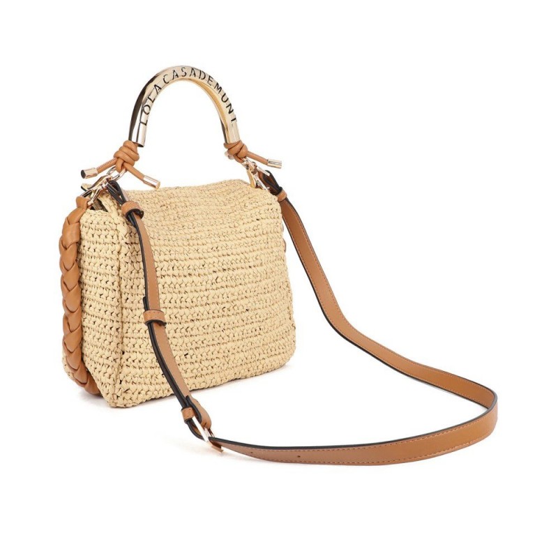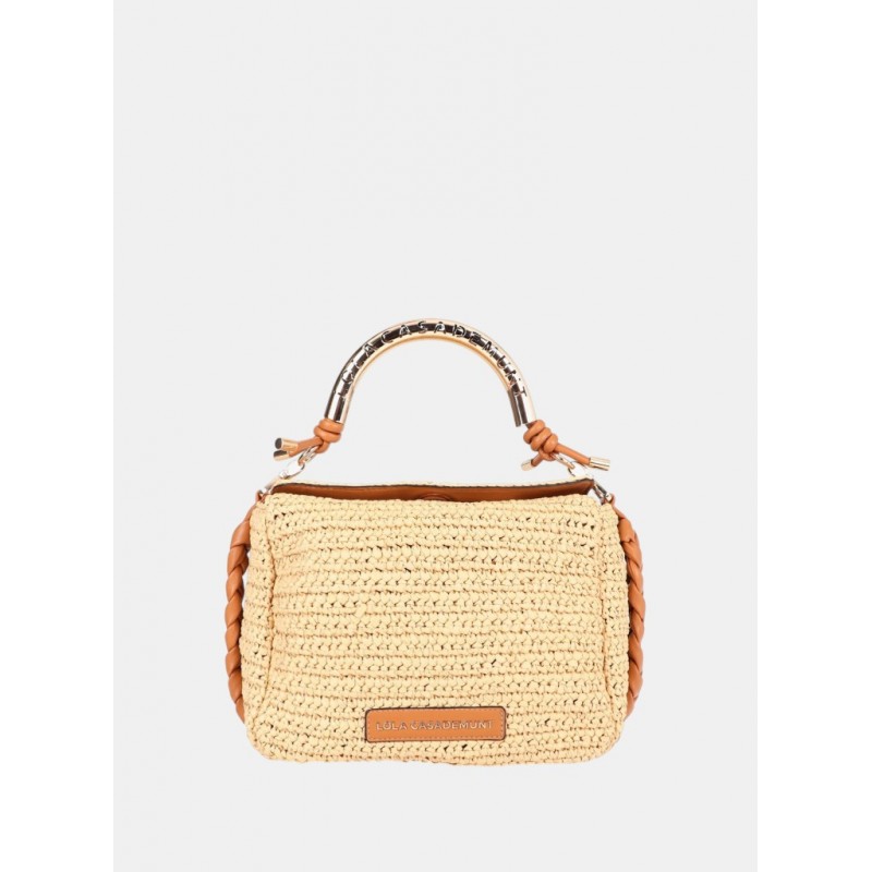 Bolso para mujer combinado en rafia y detalles en piel sintética, cierre principal de imán, detalle de la marca en metal y doble asa corta una de ellas metálica más una extraíble para llevar tipo bandolera.