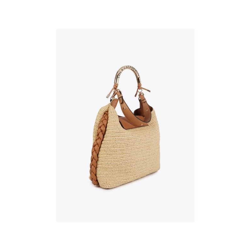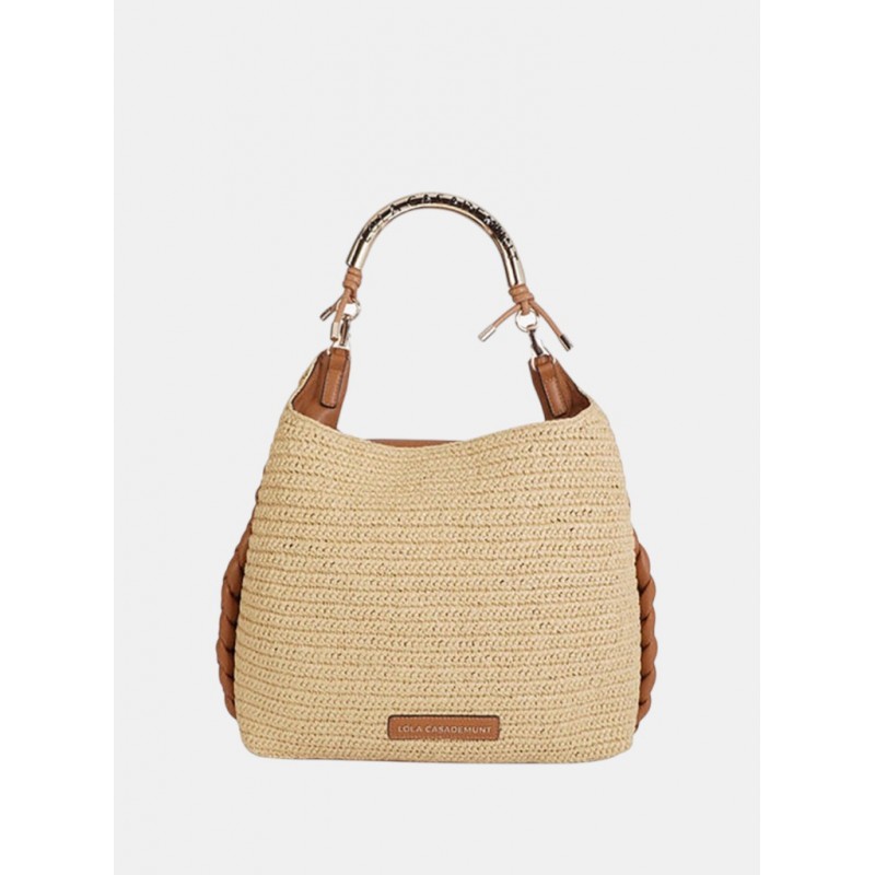 Bolso shopper para mujer combinado en rafia y detalles en piel sintética, cierre principal de solapa e imán, detalle de la marca en metal y doble asa corta una de ellas metálica.