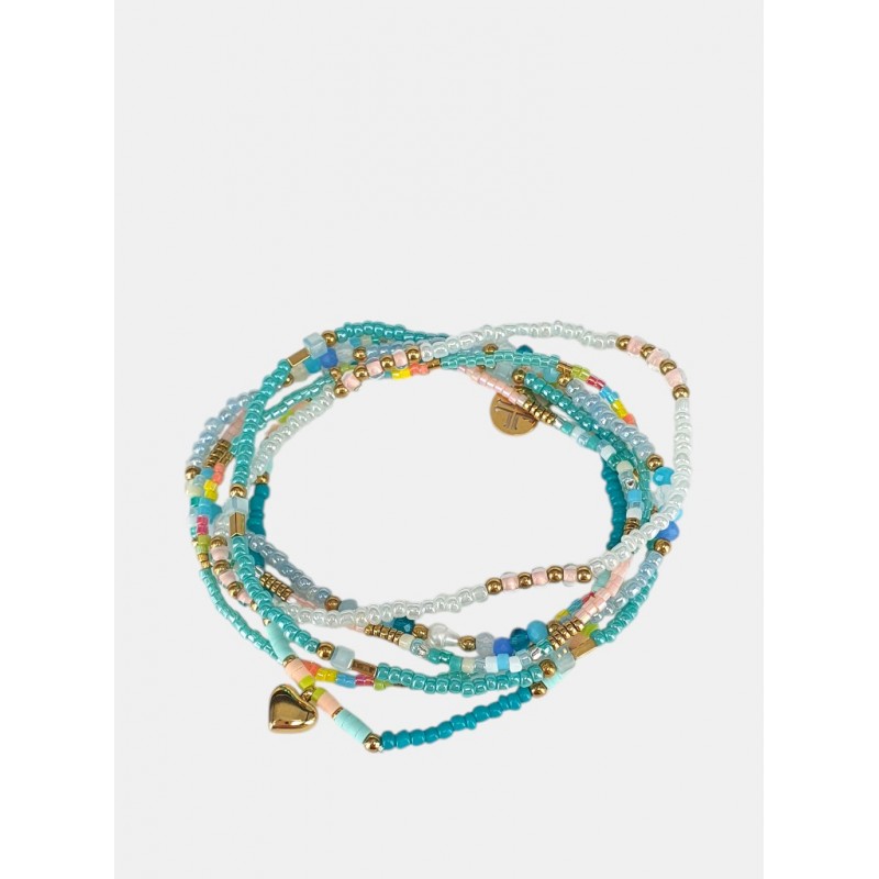 Pulsera con múltiples tiras en colores en tonalidades verdes o azules, con motivos combinados en dorado