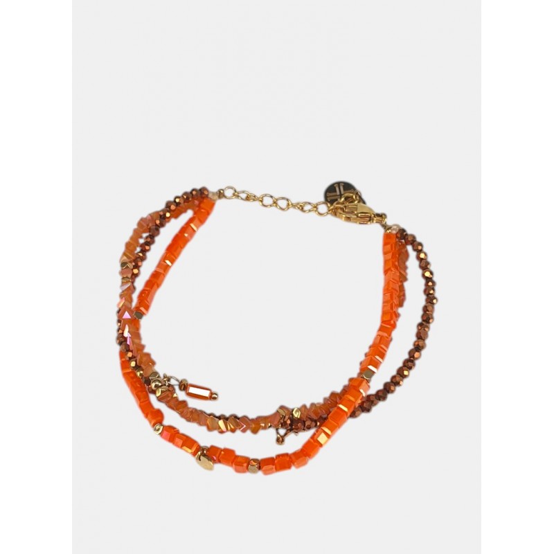 Pulsera con múltiples tiras en colores rojos; anaranjados, blancos, verdes o azules, con motivos combinados en dorado