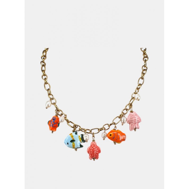 Este collar COAST combina eslabones de acero quirúrgico con abalorios maxi, peces que aportan un toque llamativo y elegante. Su diseño favorecedor y en tendencia resiste el agua sin causar alergias. Cuenta con cierre tipo langosta y cadena de extensión para un ajuste perfecto y cómodo. Ideal para realzar cualquier look con sofisticación y frescura.