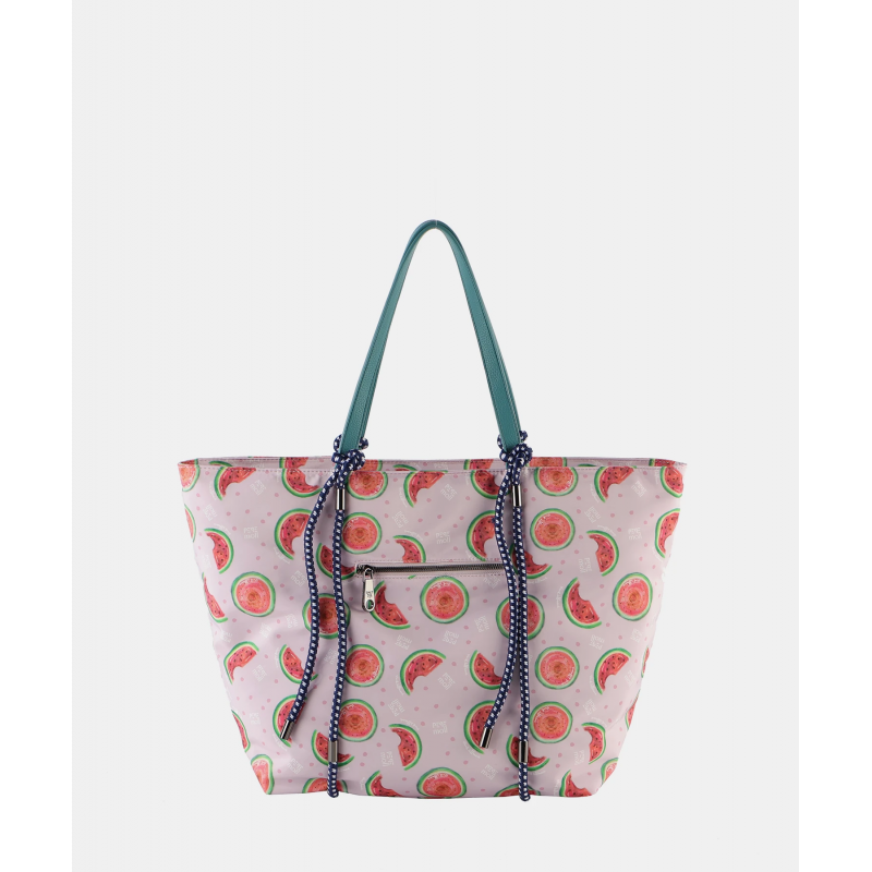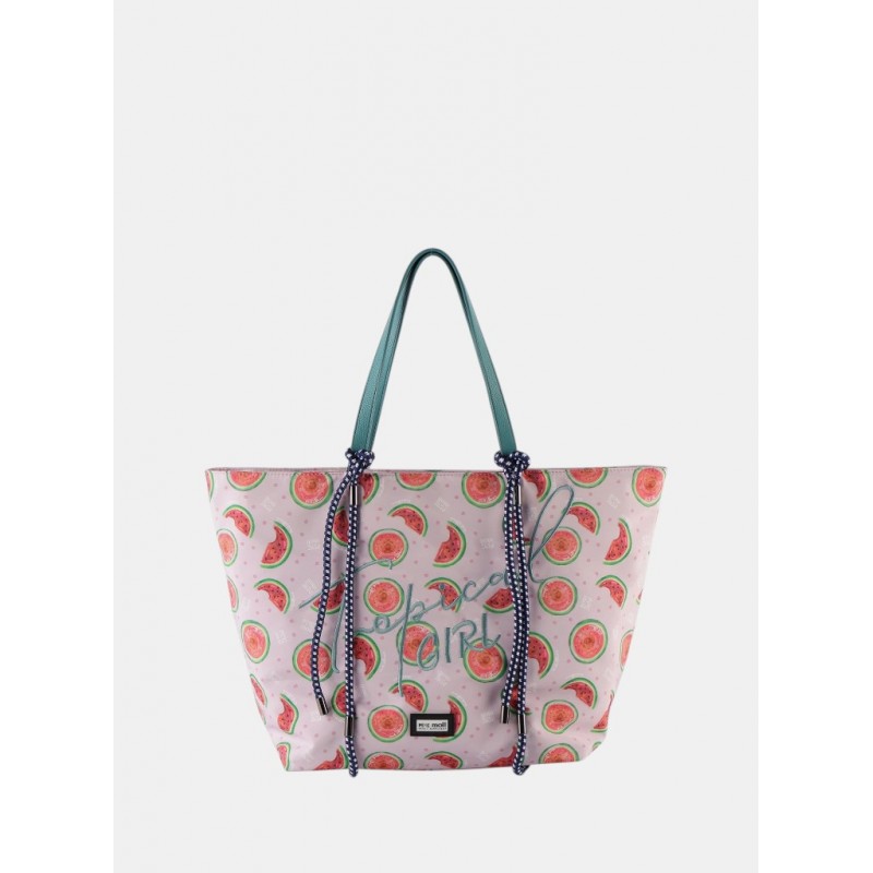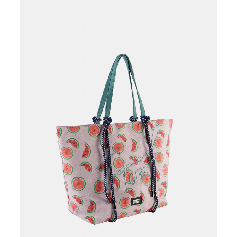 Bolso shopper para mujer de diseño de fresas, cierre prindial de cremallera, compartimentos interiores, bolsillo exterior, detalle de la marca y doble asa a contraste para lleevar al hombro. Ideal para uso diario.