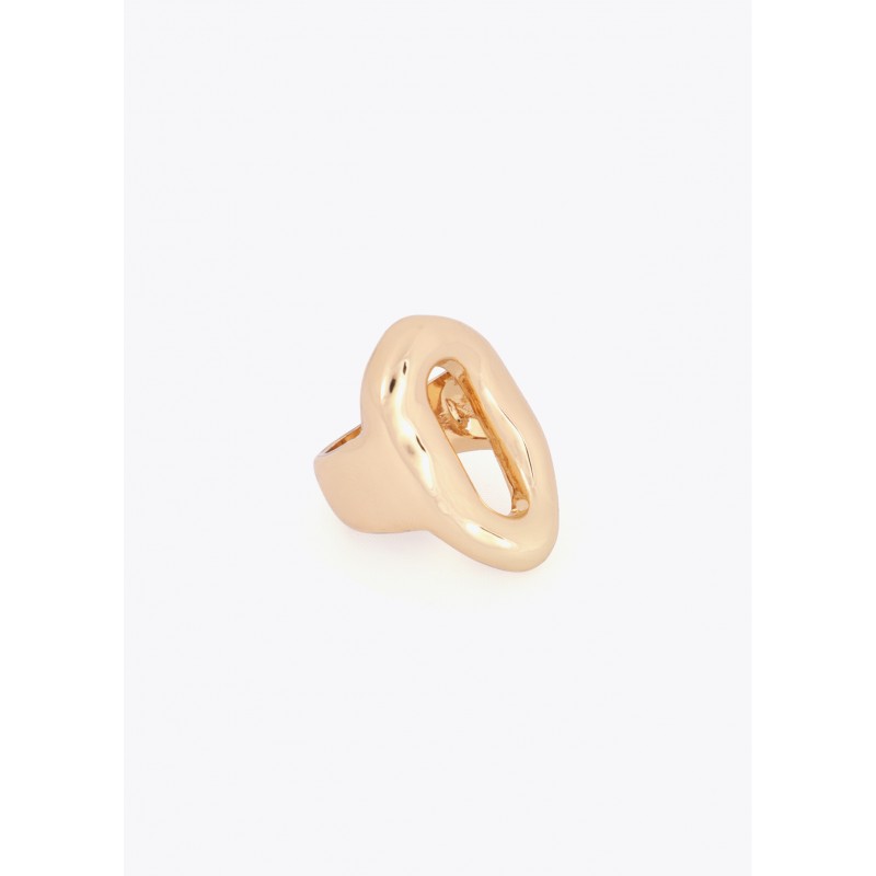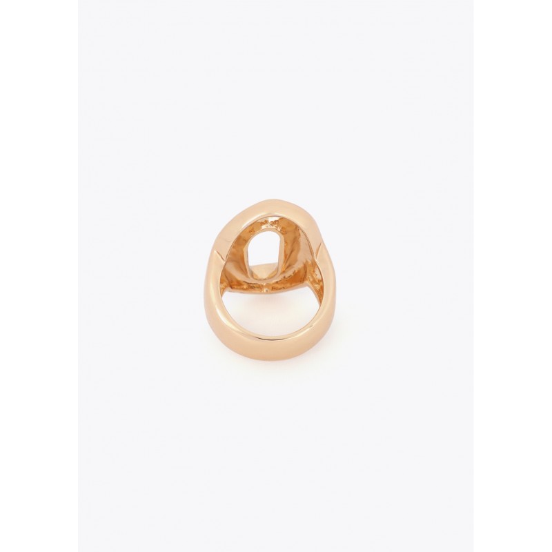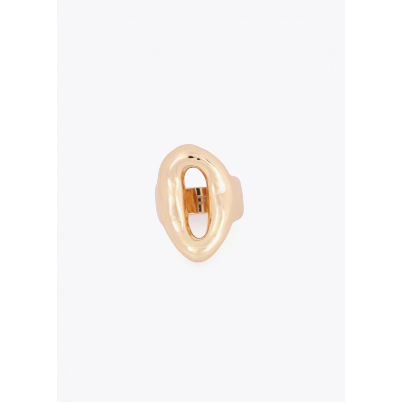 Anillo metálico con diseño de eslabón en relieve, acabado dorado pulido de alta calidad. Aporta un toque sofisticado a cualquier look gracias a su diseño audaz y moderno. Perfecto para combinarlo con otros accesorios de la colección, este anillo se ada