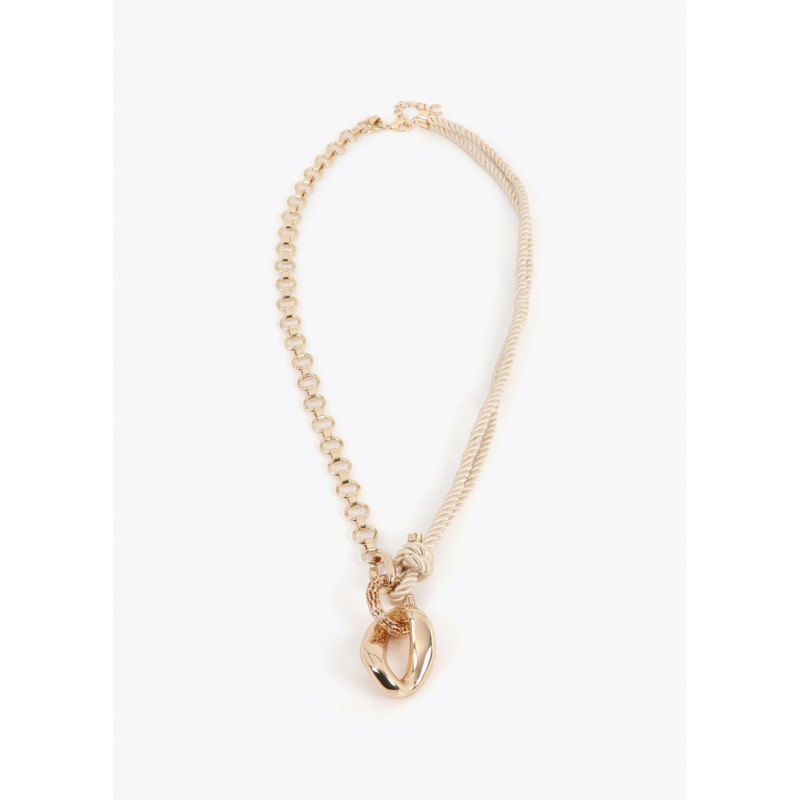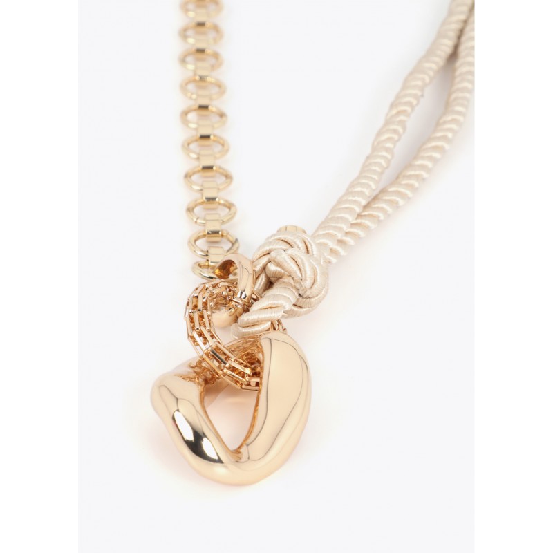 Collar largo diseñado con eslabones metálicos combinados y detalle en cuerda trenzada. Su cierre ajustable permite el ajuste perfecto. Complemento versátil y sofisticado para cualquier ocasión.