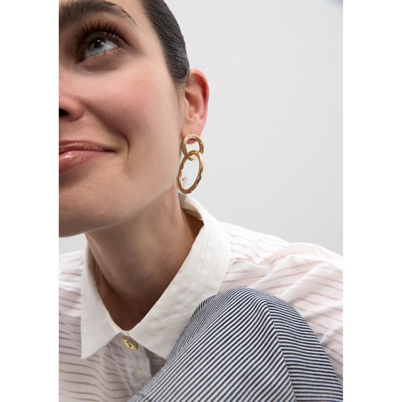 Pendientes elegantes con diseño de doble aro dorado, perfectos para un toque sofisticado. Acabado brillante con cierre de tuerca. Un must para cualquier ocasión especial.