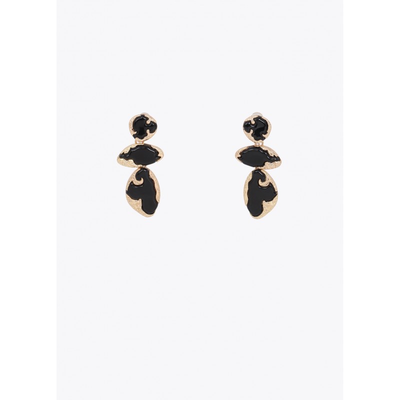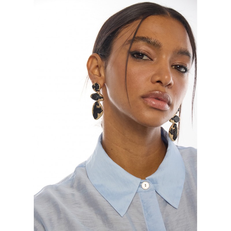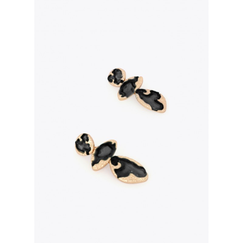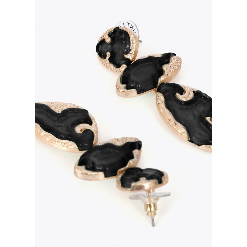 Pendientes de gran tamaño con diseño metálico y lacado. Combina formas orgánicas en tonos oscuros y acabado dorado. Cierre de presión para mayor comodidad. Un complemento ideal para elevar cualquier look.