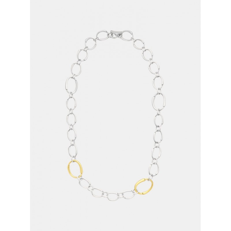 Collar para mujerlargo de líneas fluidas, formado por eslabones en forma de ovalo en dos tamaños que crean una sensación de movimiento continuo, baño de plata y oro, cierre en forma de T que suma carácter al diseño. Una joya expresiva, pensada para llevar sola o superpuesta, y para quienes buscan piezas con personalidad y equilibrio.