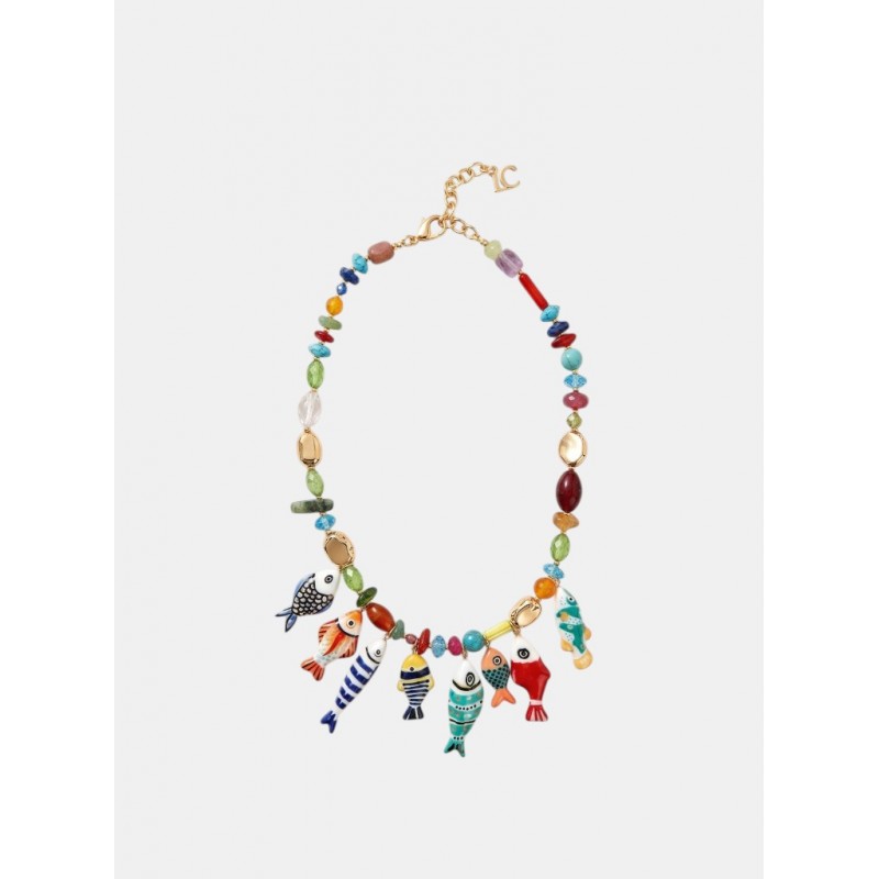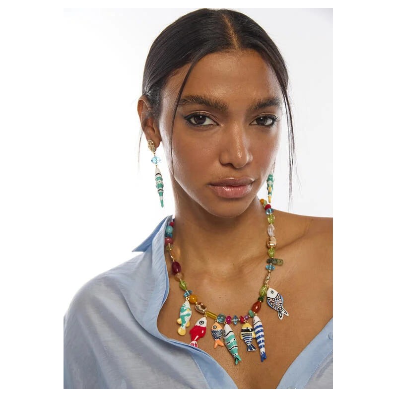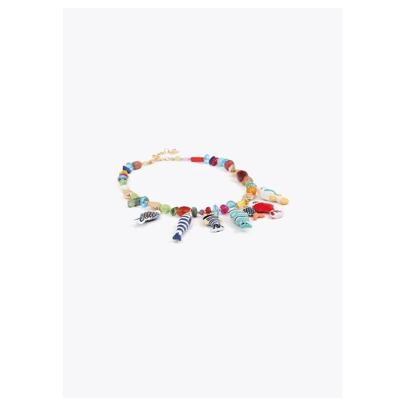 Collar vibrante con cristales multicolor y encantadores charms de peces, perfecto para añadir un toque de color a cualquier look. Cierre ajustable y detalles en dorado.