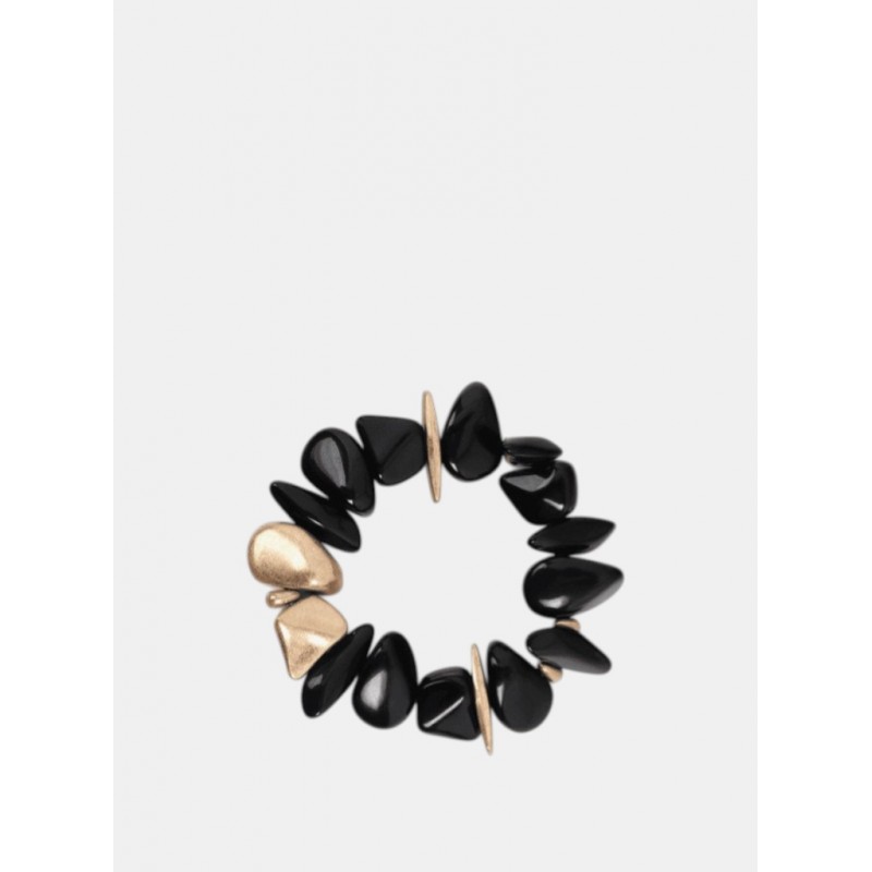 Pulsera elástica adornada con piezas metálicas y esferas en tonos dorado y negro. Diseño cómodo y ajustable que se adapta a cualquier muñeca. Perfecta para complementar tus looks con un toque de sofisticación.
