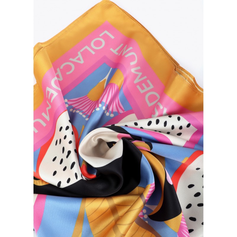 Pañuelo elegante en seda satinada con vibrante estampado tropical. Ideal para añadir un toque de color a cualquier atuendo. Suavidad y brillo excepcionales al tacto.