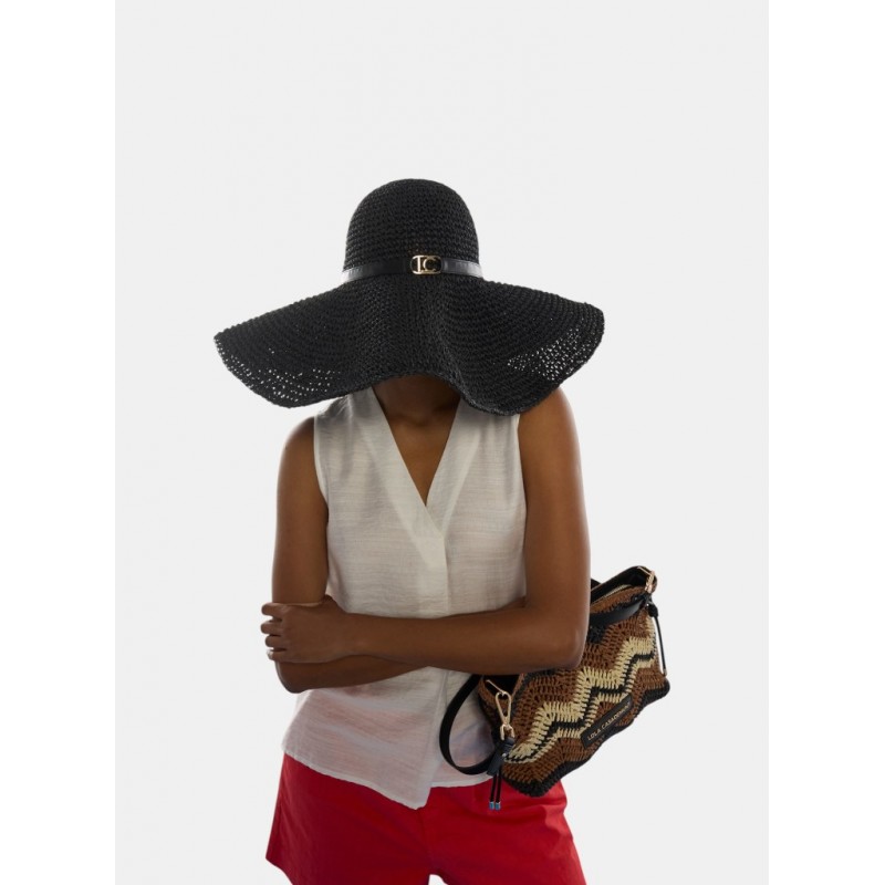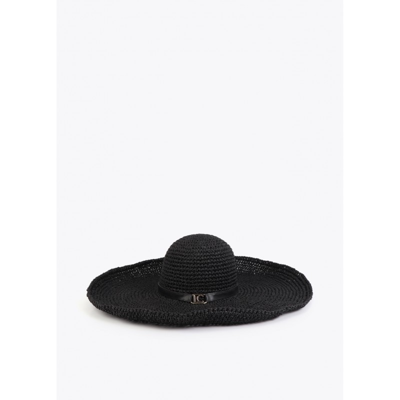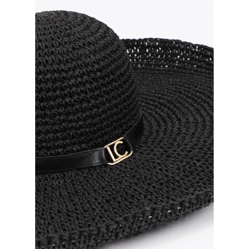 Sombrero elegante de ala ancha confeccionado en material que imita la rafia. Presenta un diseño sofisticado con detalle de cinta con logotipo dorado. Ideal para aportar glamour y protección solar en días de verano.