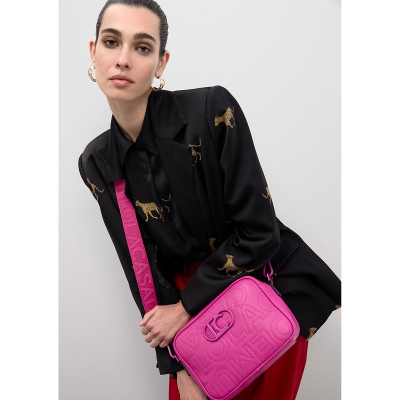 Bandolera vibrante con pespuntes monogramas, ideal para cualquier ocasión. Dos correas ajustables, cierre seguro de cremallera y logo frontal destacado. Maerial duradero.