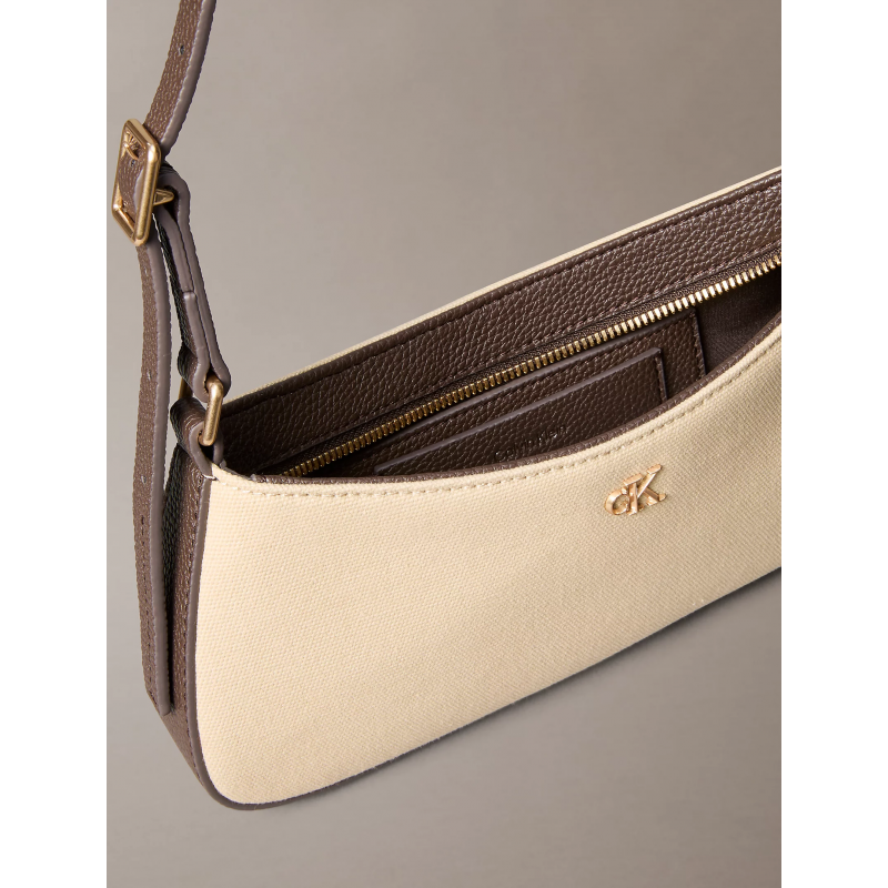 Bolso lona de cierre principal de cremallera, detalle con monograma metálico en la parte frontal y asa ajustable para llevar tipo bandolera.