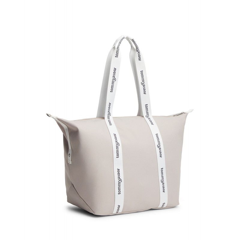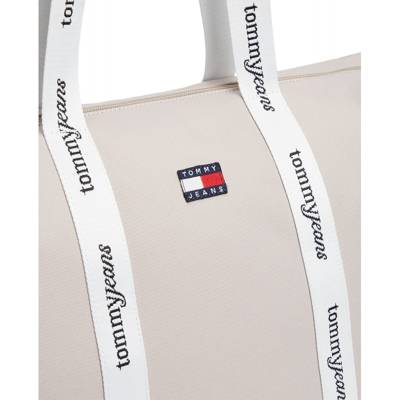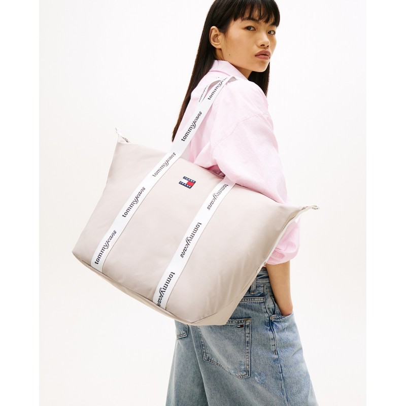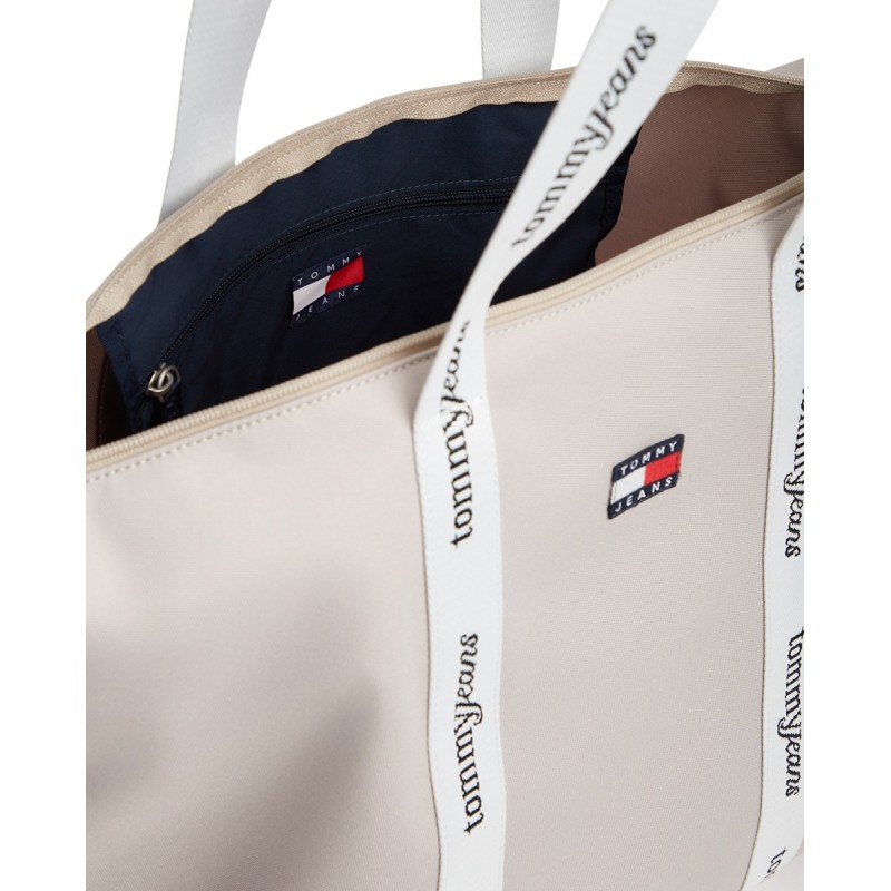 Bolso tote para mujer de cierre principal de cremallera, bolsillo interior, detalle de parche del logo en la parte delantera y doble asa para llevar al hombro.
