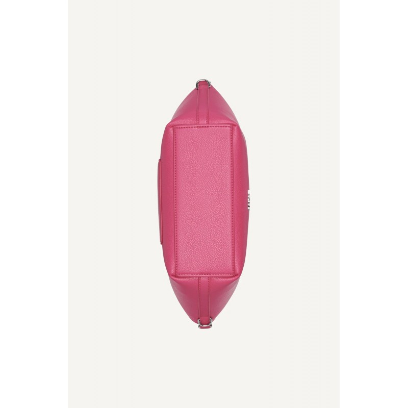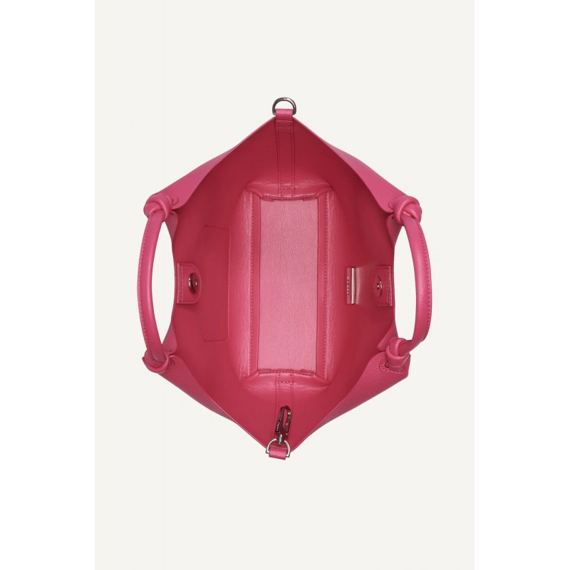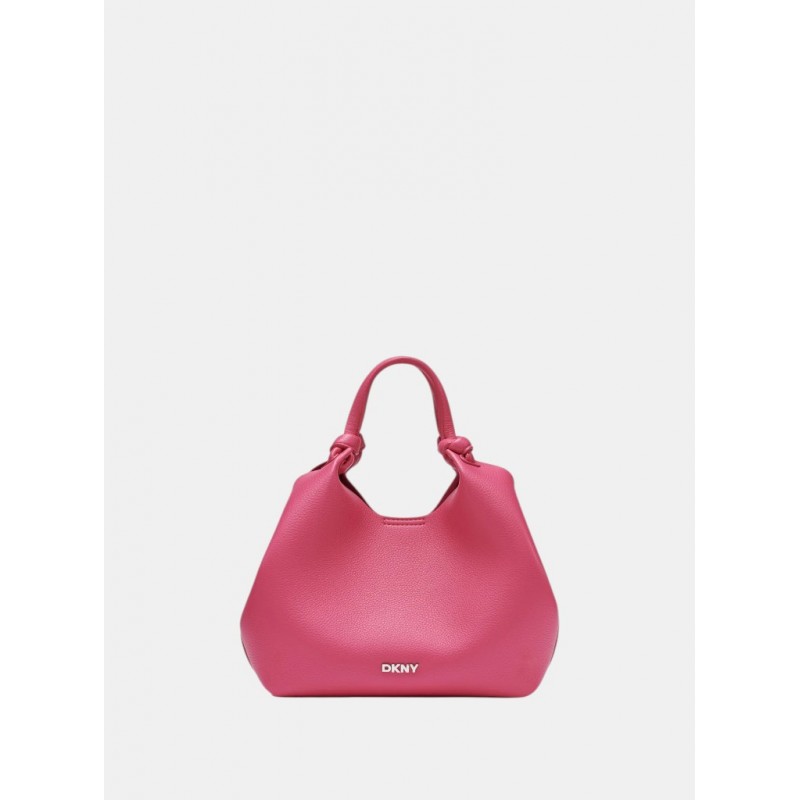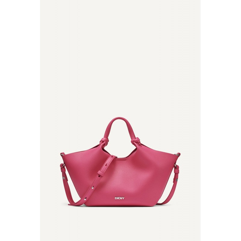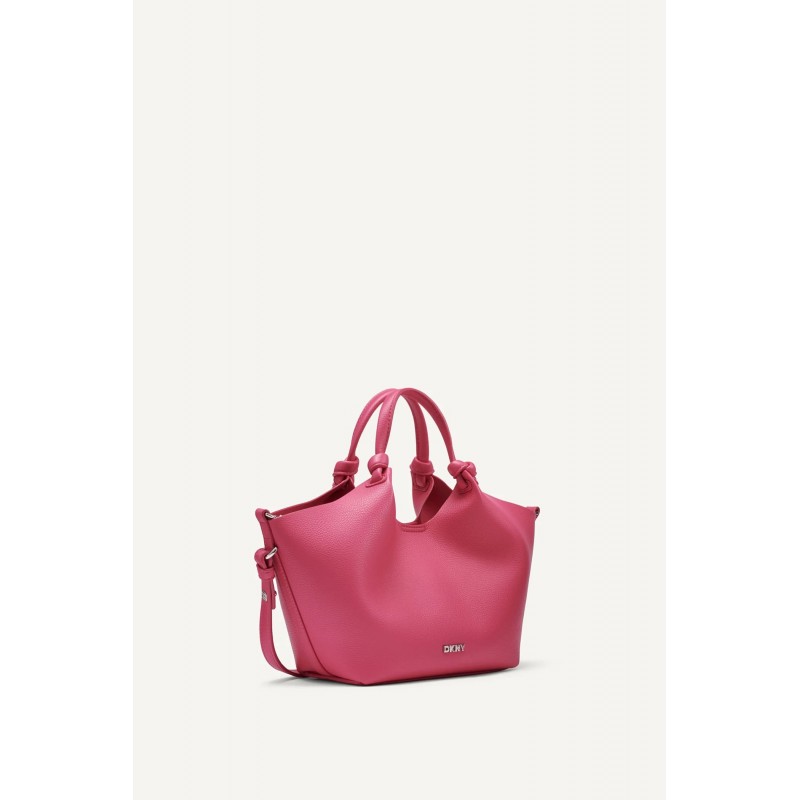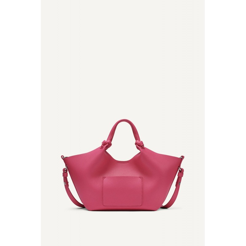 Bolso tote pequeño para mujer con asa de mano y detalle de nudo, mosquetones en los laterales para modificar su forma, y ​​cierre de botón imantado. Correa extraíble y regulable tipo bandolera.