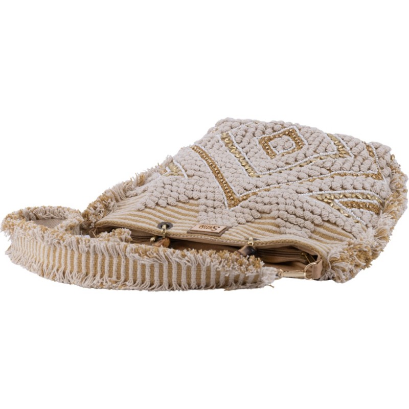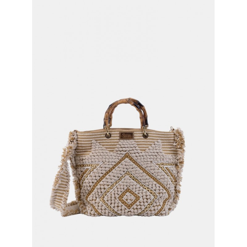 Bolso tote para mujer de cierre principal de cremallera con diseño bordado y flecos decorativos más doble asa de bambu para llevar de mano y otra extraíble para llevar tipo bandolera.