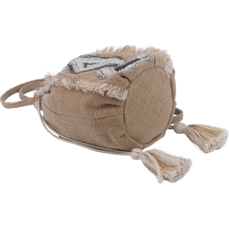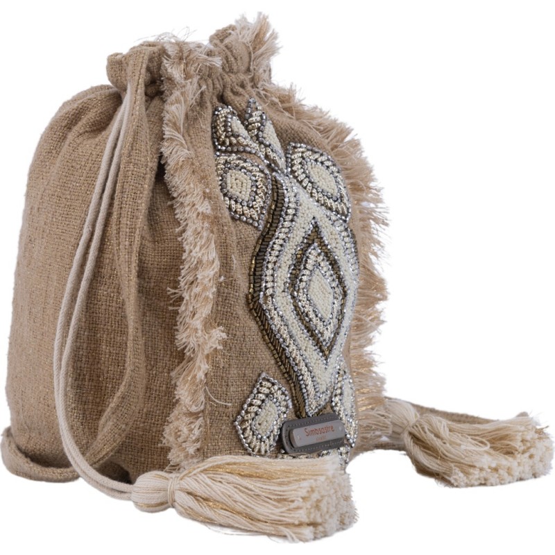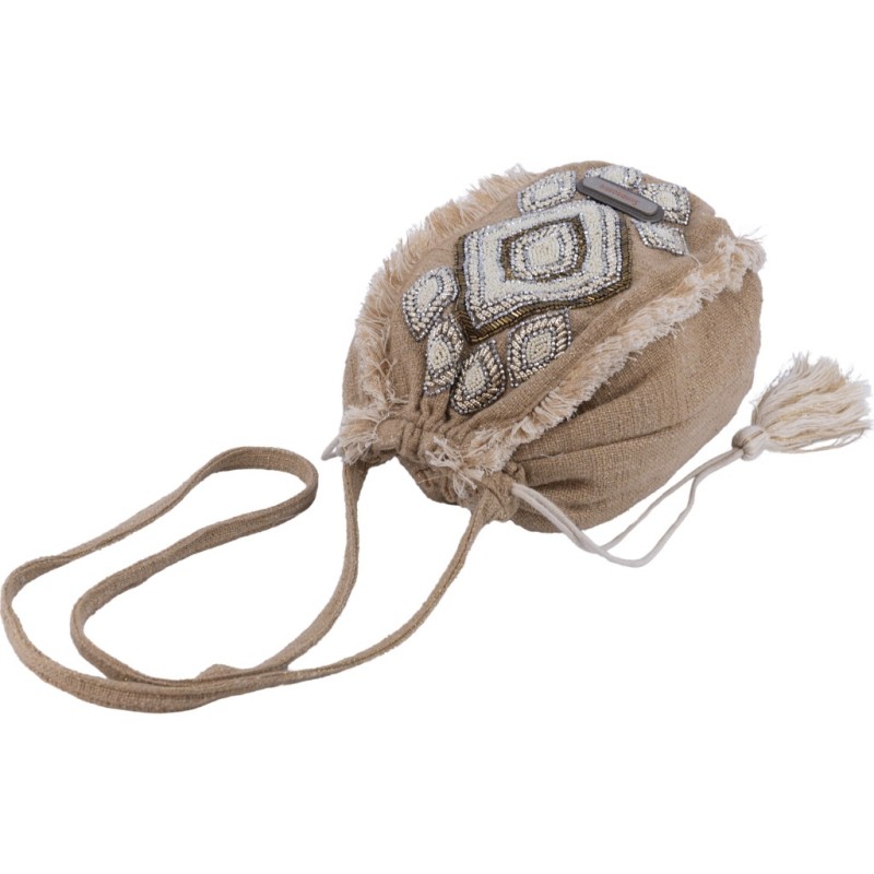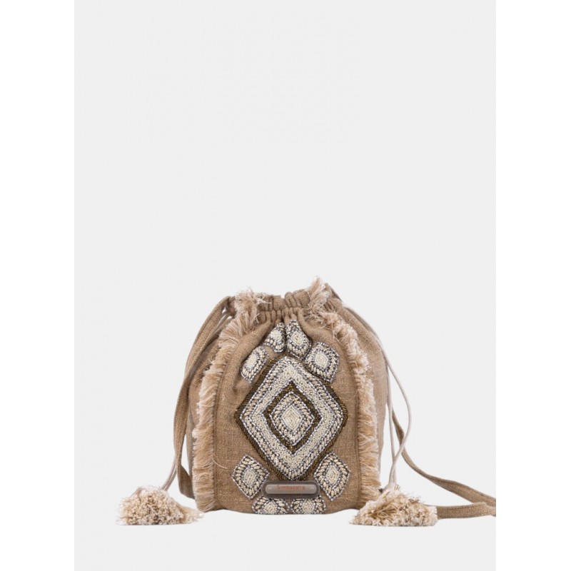 Bolso tipo saco para mujer de diseño de pedrería, cierre ajustable con cordones de flecos y asa para llevar al hombro.