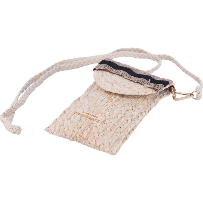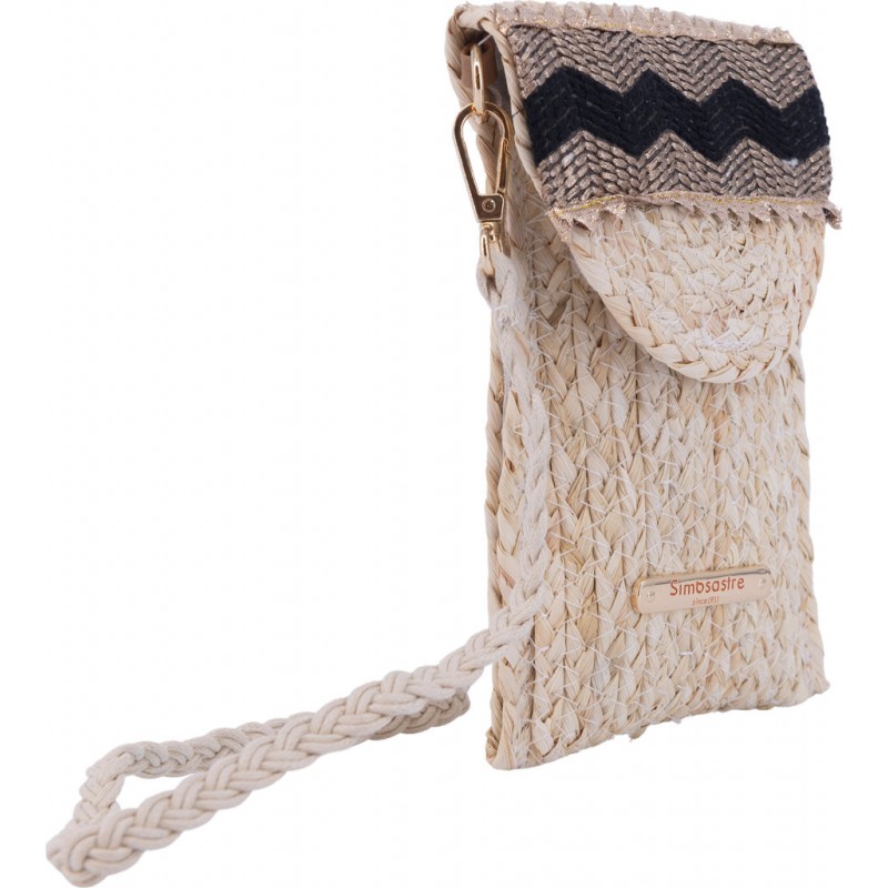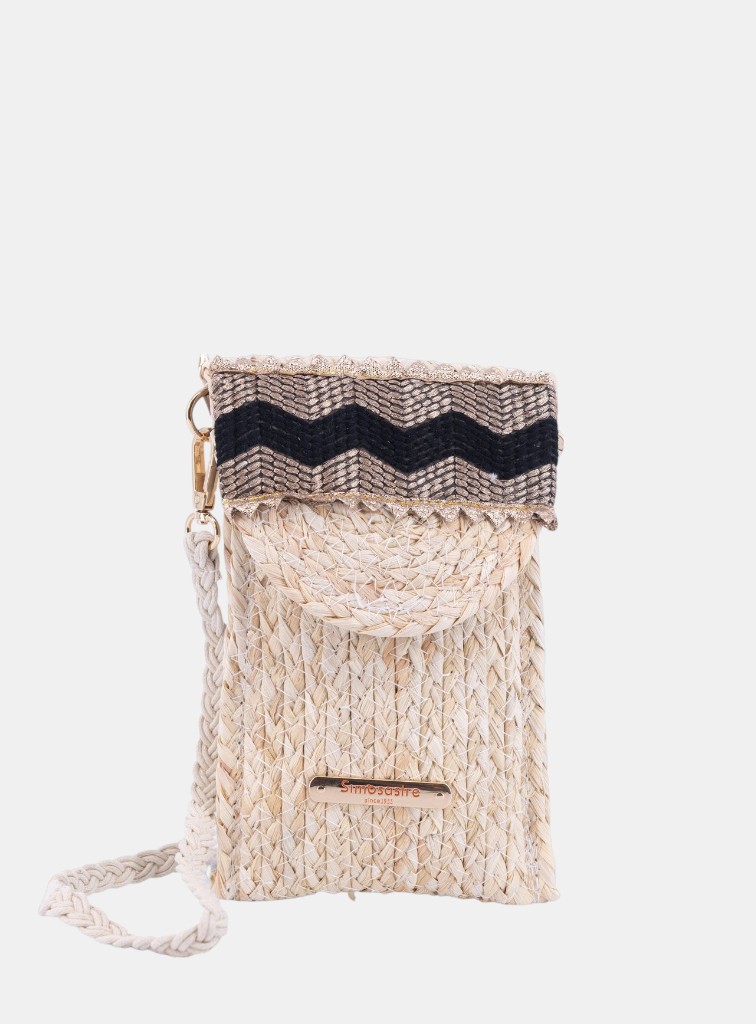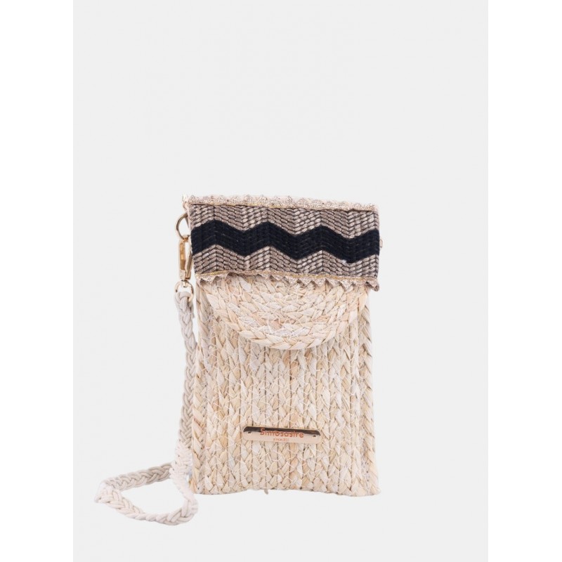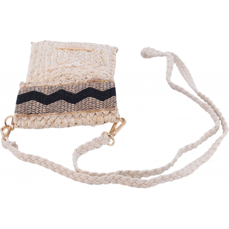 Mini bolso para porta móvil fabricado de cierre de solapa con botón de imán, detalles de la marca, asa bandolera trenzada de diseño con pasamanería de yute en natural y diseño zigzag con piedras decorativas. Ideal para un estilo casual o de verano.