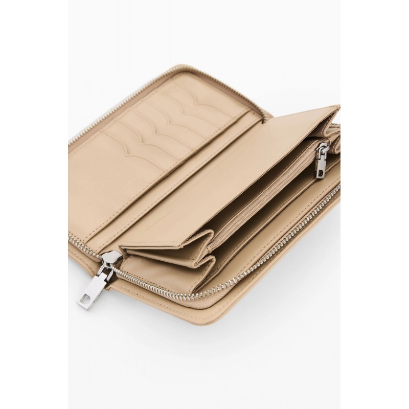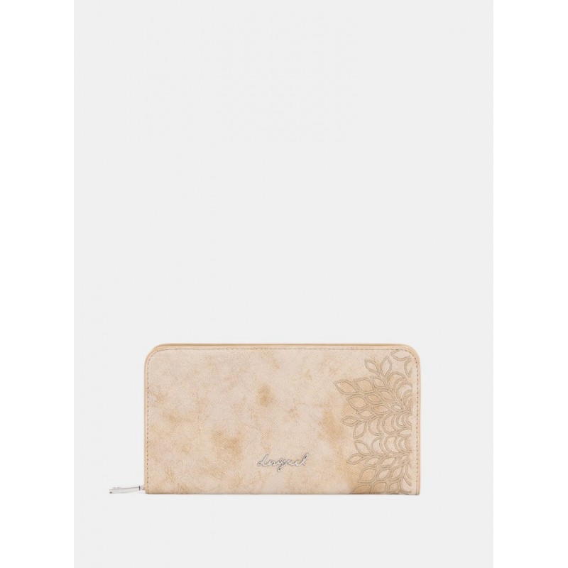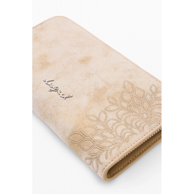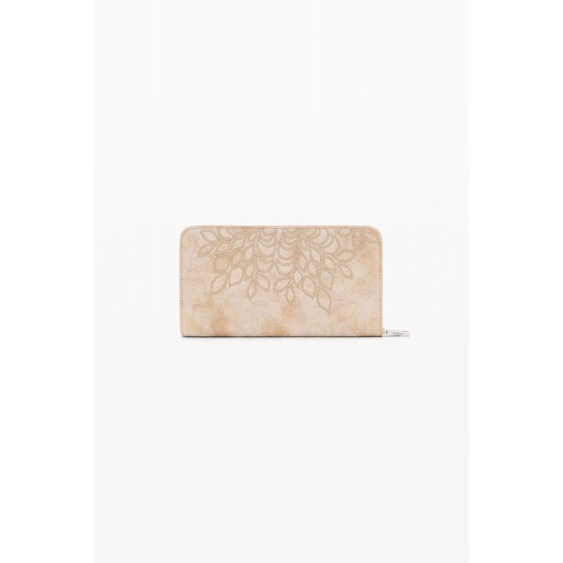 Cartera monedero rectangular para mujer de cierre principal de cremallera, detalles bordados,  logo en la parte frontal metálico compartimento para tarjetas y otro para monedas.