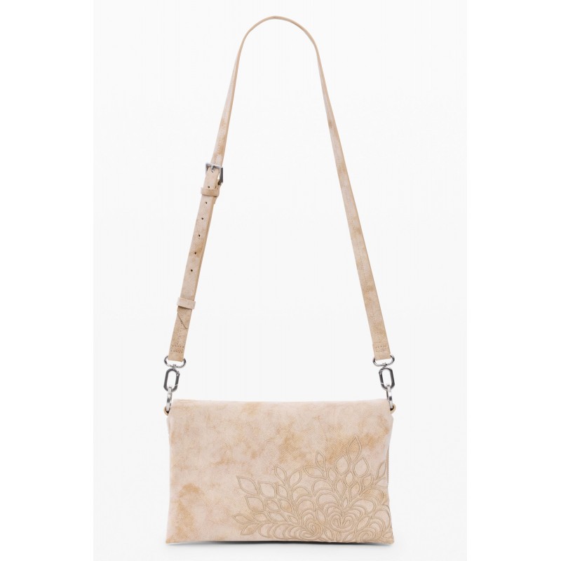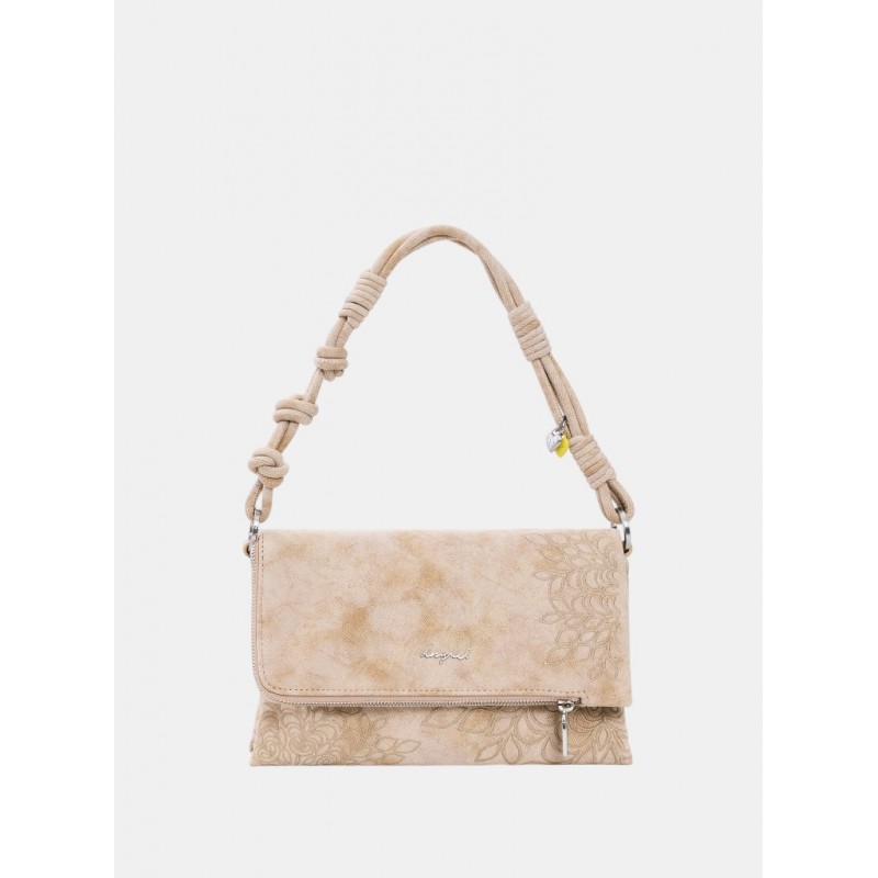 Bolso mediano de solapa con cierre de cremallera más botón magnético, diseño de detalles bordados, bolsillo interior con cremallera, logo metálico grabado y asas intercambiables para llevar al hombro o tipo bandolera.