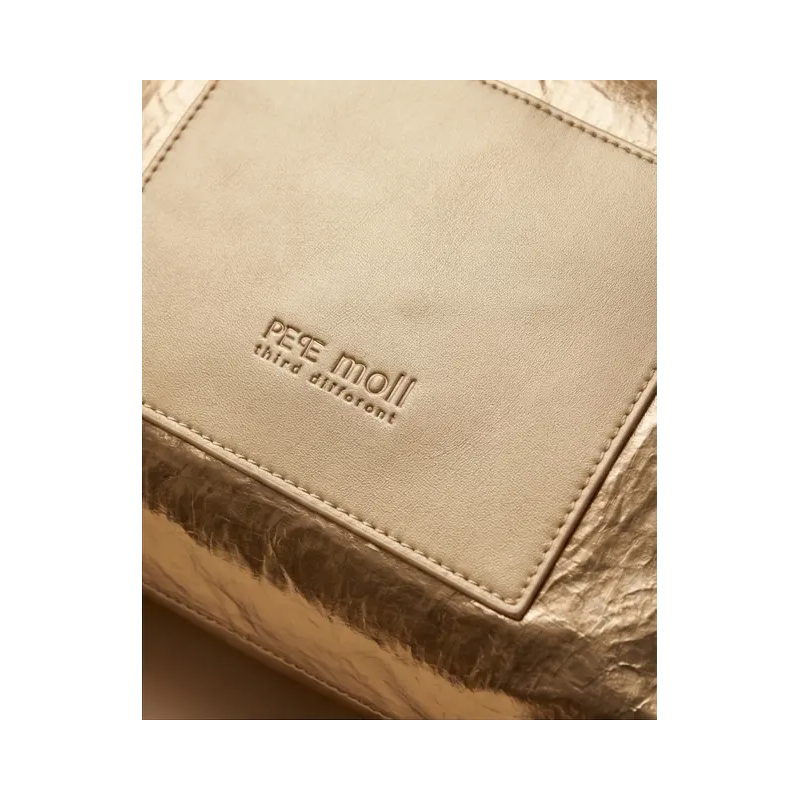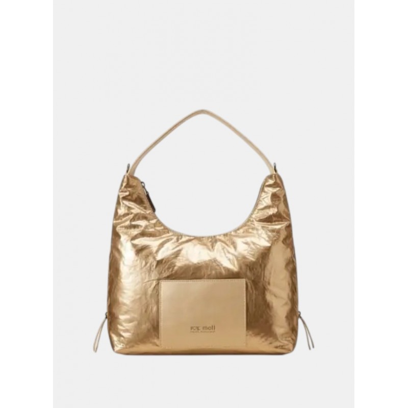 Bolso para mujer de diseño fruncido con cordones ajustables a los lados, cierre de cremallera, detalle de marca en la parte frontal, bolsillo interior y exterior más asa para llevar al hombro.