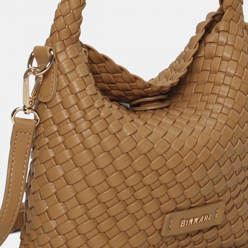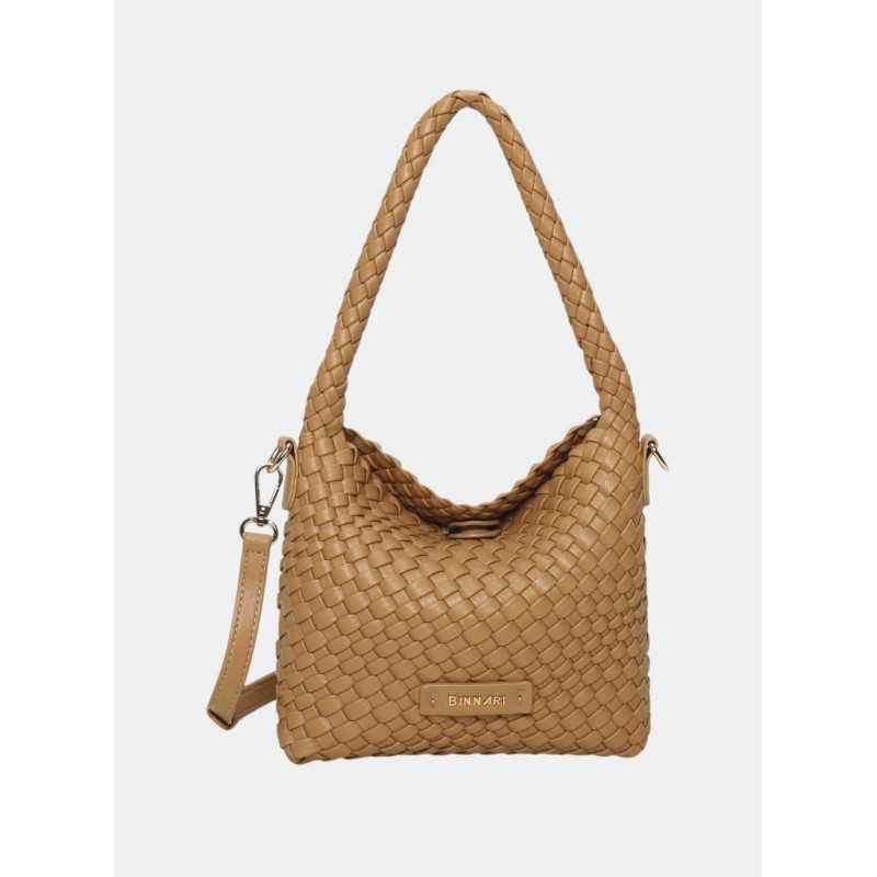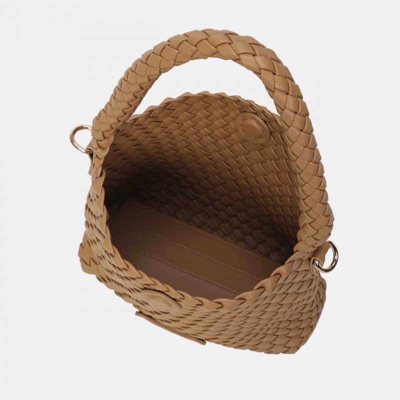 Bolso de tamaño compacto confeccionado en PU trenzado, con un diseño actual y muy cómodo para el día a día. Su asa corta permite llevarlo al hombro, y además incluye una correa ajustable y removible para usarlo como bandolera cuando lo necesites. Los detalles metálicos en tono oro claro añaden un acabado elegante. ¡Un accesorio versátil y perfecto para completar cualquier look!
