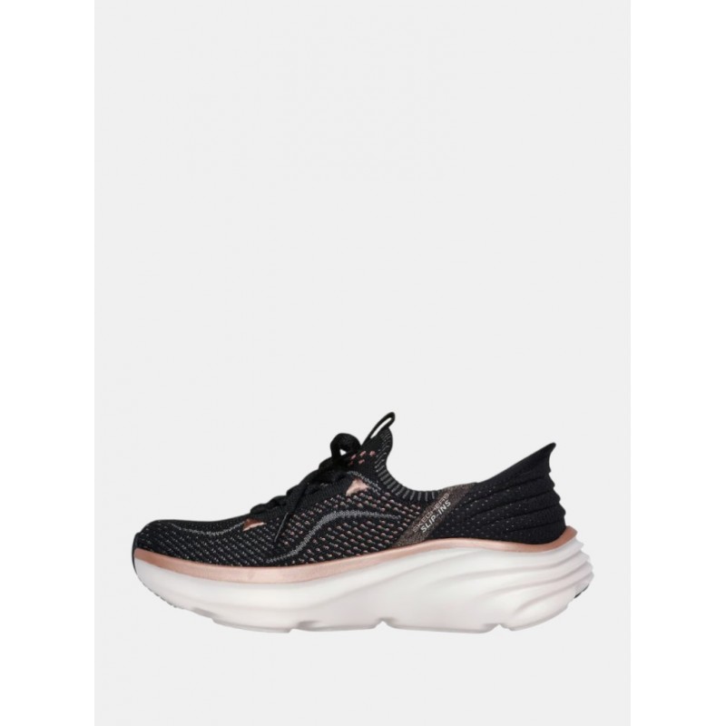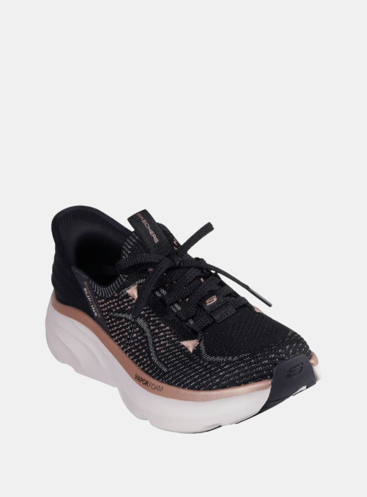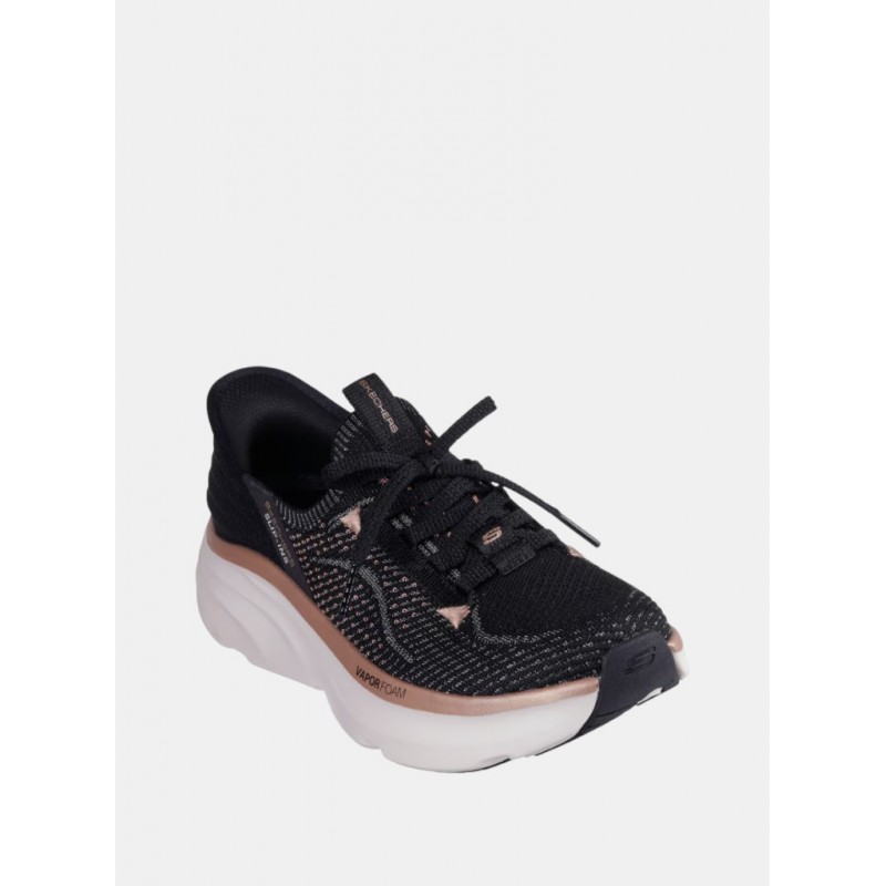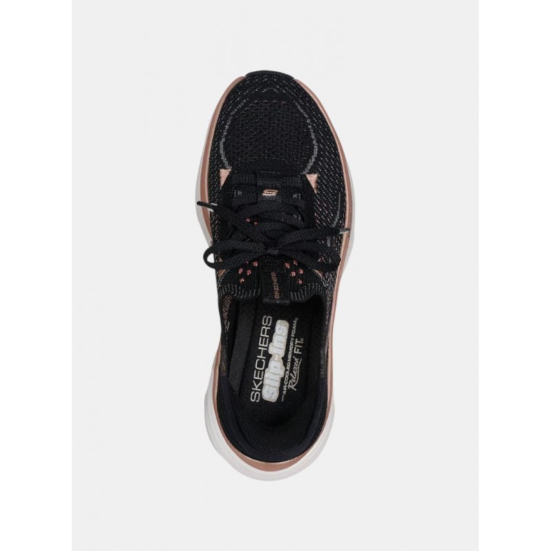 Deportivo para mujer diseñado con nuestro Heel Pillow™, estas zapatillas veganas con cordones fijos presentan una parte superior de knit técnico Stretch Fit® con ribete metálico, media suela Vapor Foam® y plantilla con amortiguación Skechers Air-Cooled Memory Foam™ con una altura de talón de 5 cm.