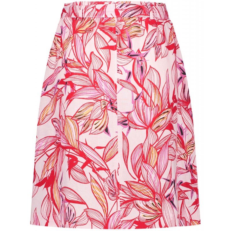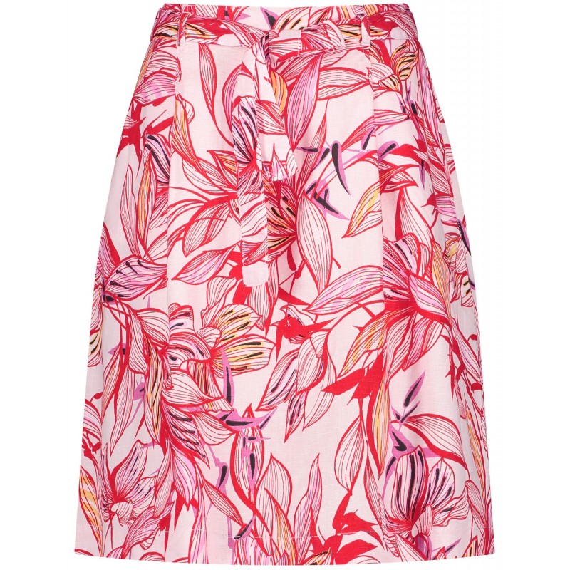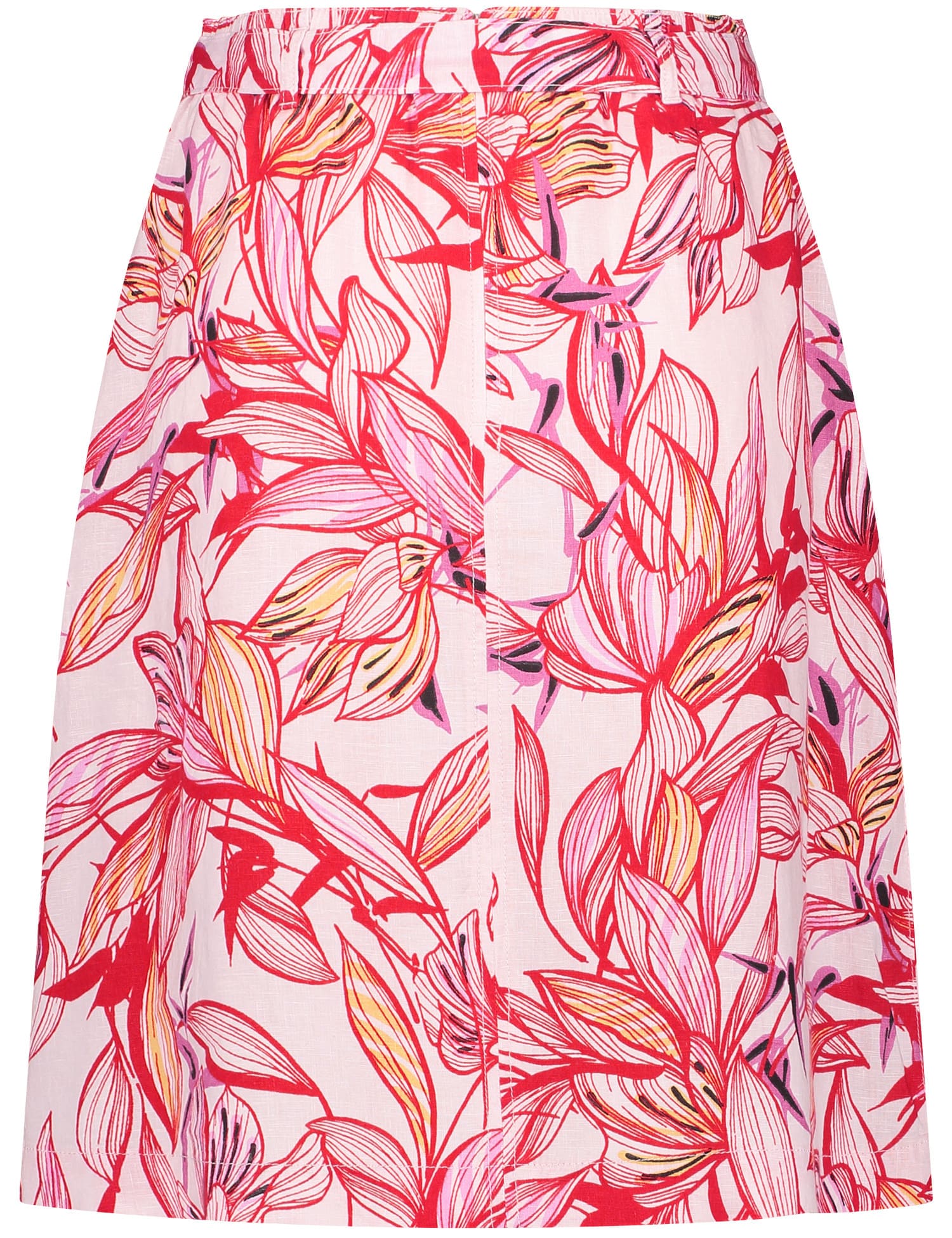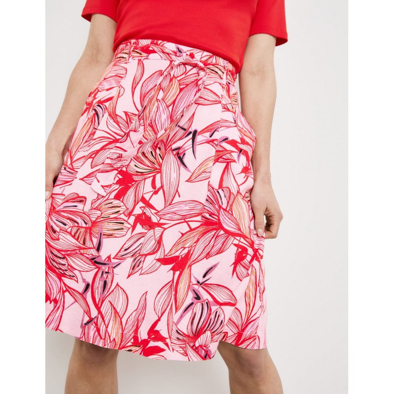 Falda evasé de lino hasta las rodillas con cinturilla elástica en la parte posterior lo hace cómodo de llevar. Cinturón de tela que se ata alrededor y un estampado de hojas.