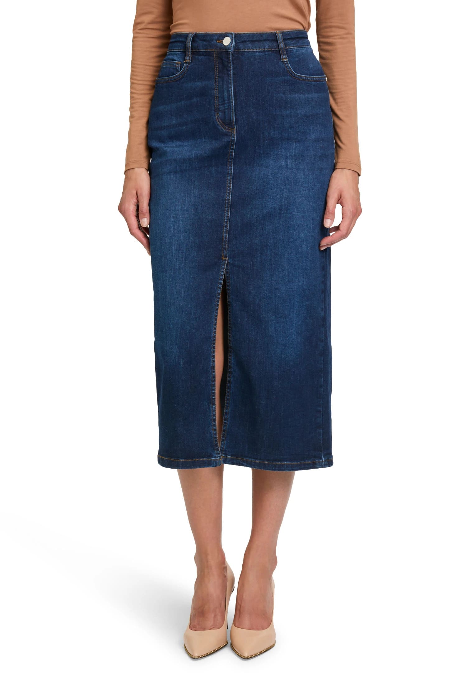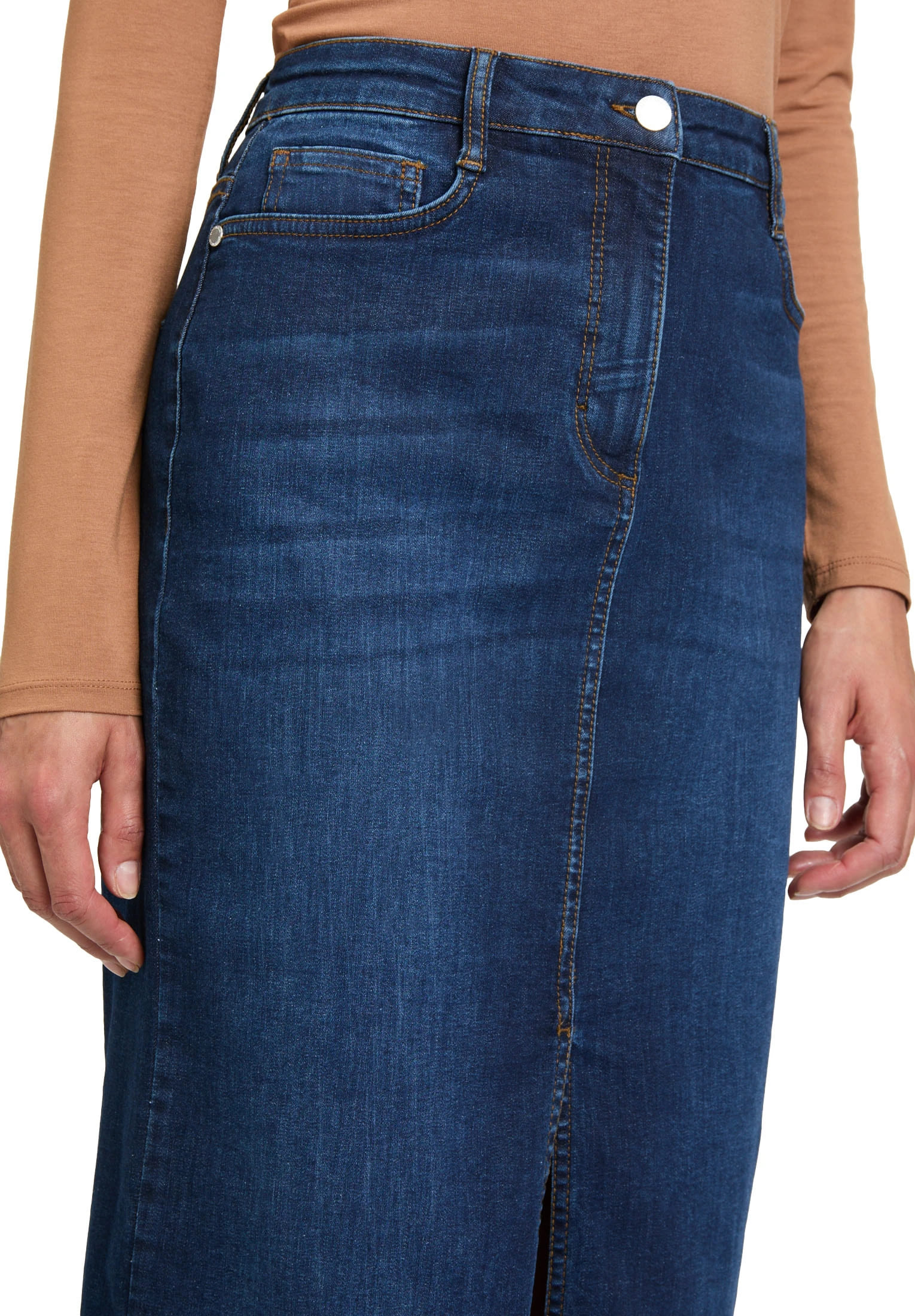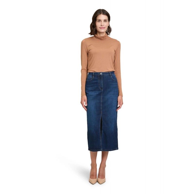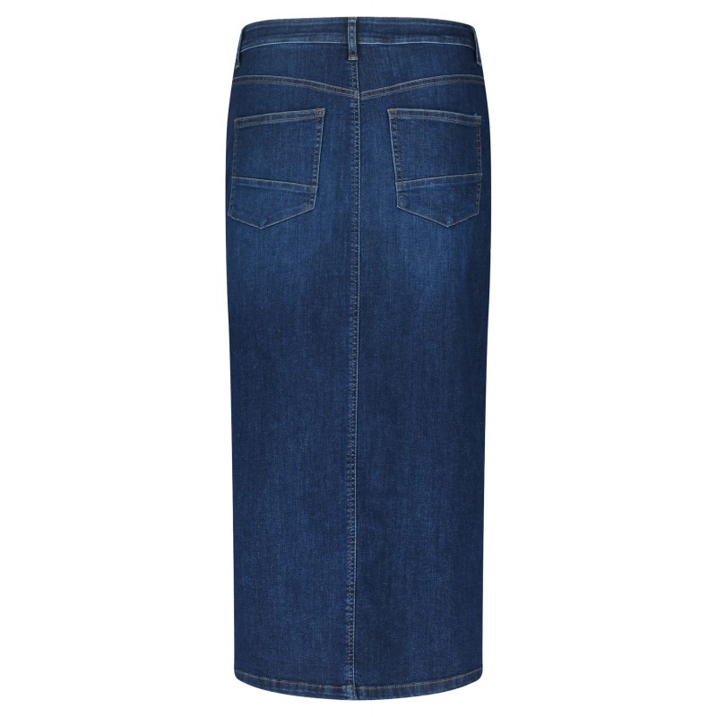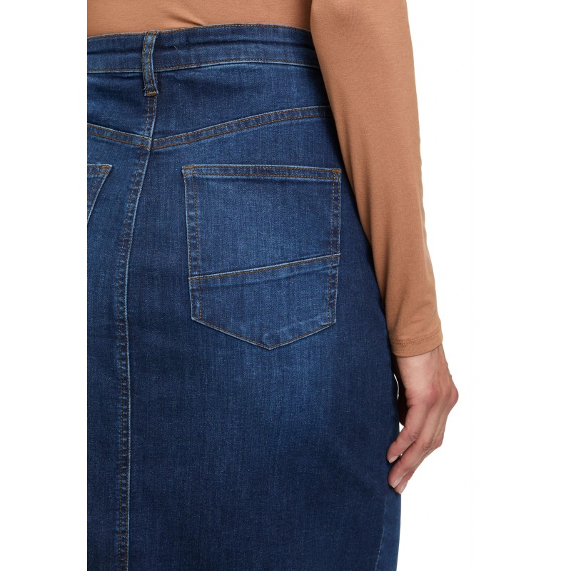 Falda midi tejana para mujer de cierre de botón y cremallera, más 5 bolsillos y abertura en la parte delantera.