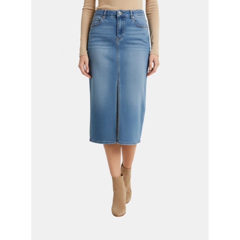 Falda tejana para mujer de abertura parte delantera, cierre de botón con cremallera y cinco bolsillos.