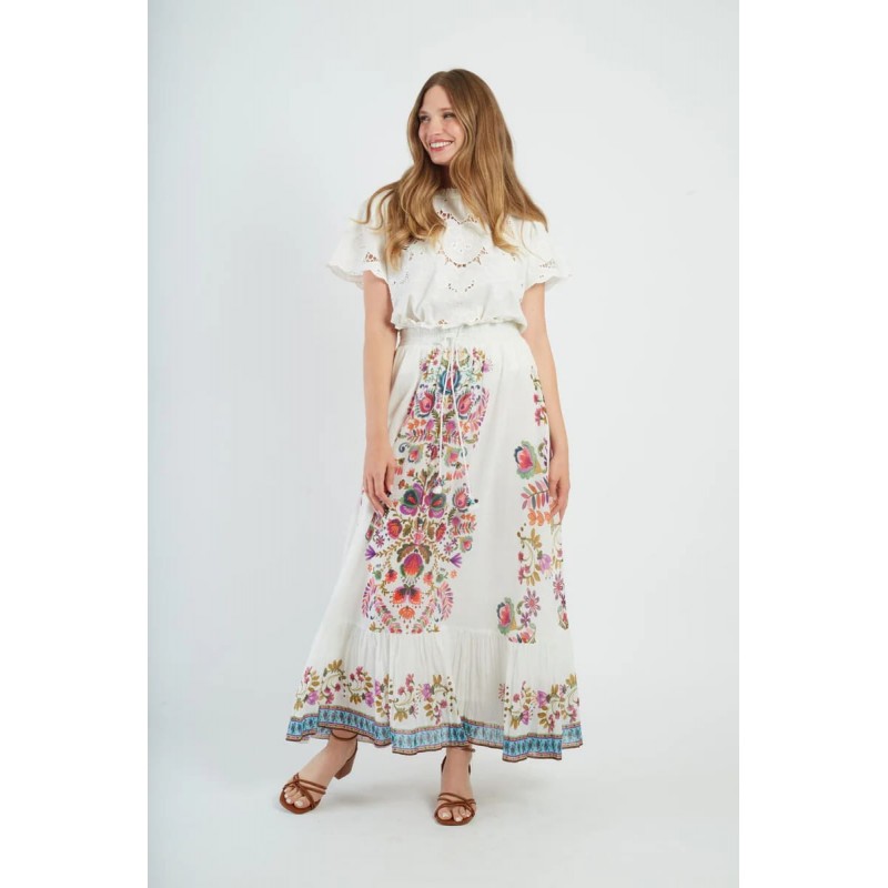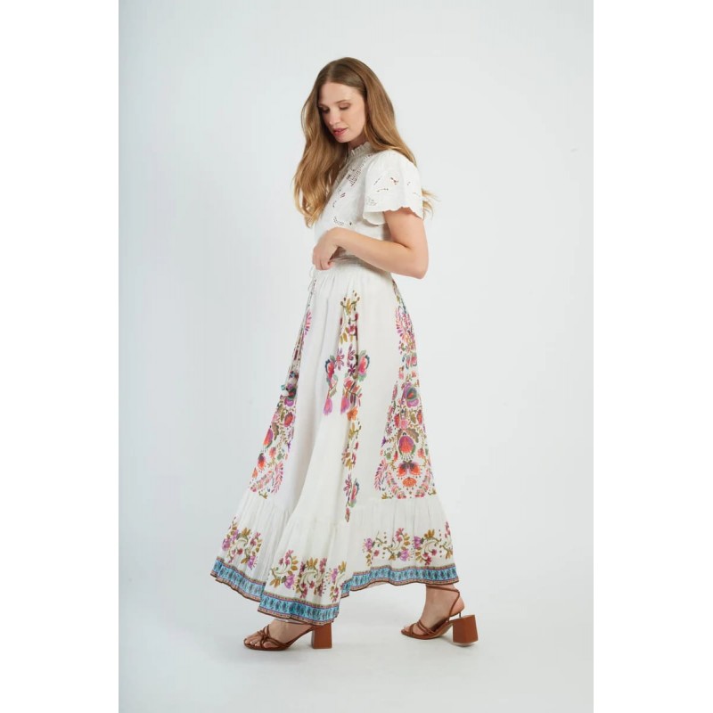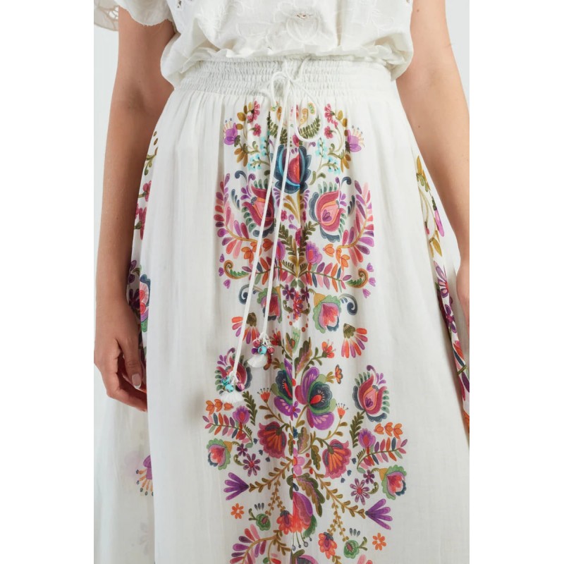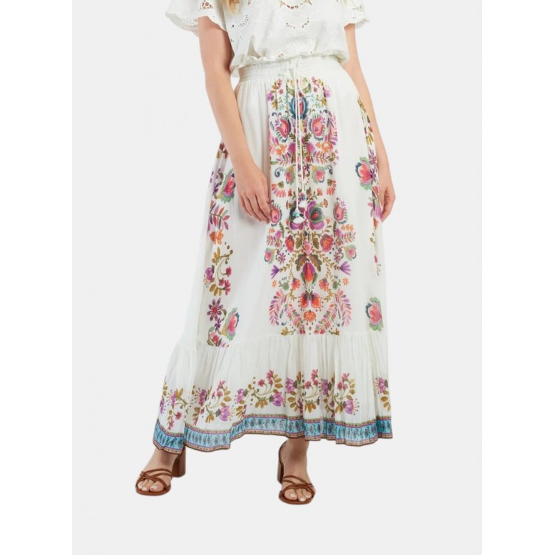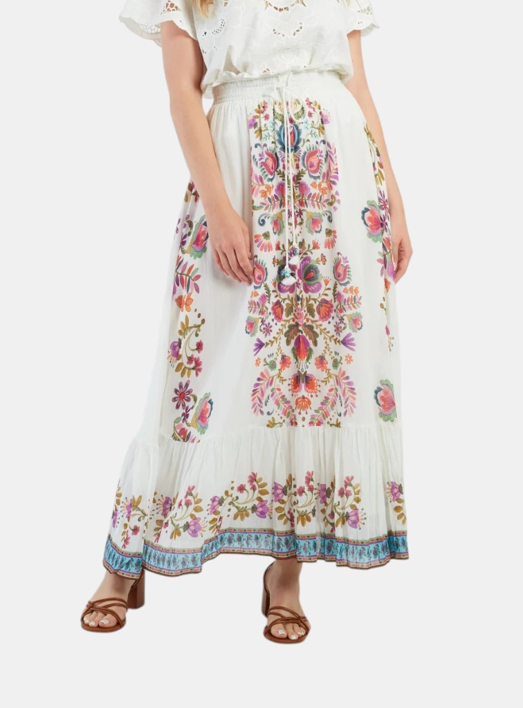 Falda larga de algodón adornada con delicados estampados florales. Su corte fluido y acampanado, con ribete en contraste en el bajo, le aporta un toque de sofisticación. Cintura elástica para un ajuste cómodo y natural. Forrada en algodón para mayor comodidad. Ideal para el verano y para looks femeninos cotidianos.