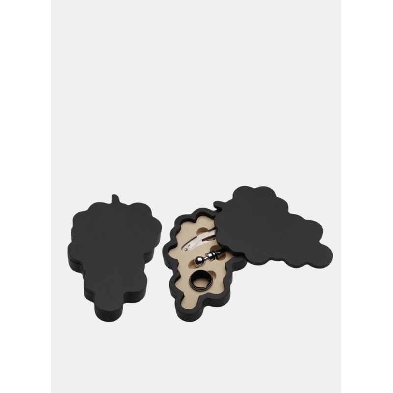 Set de 3 accesorios para vino. Se presenta en un estuche de dos piezas con la silueta de un racimo de uvas, ideal para regalar.