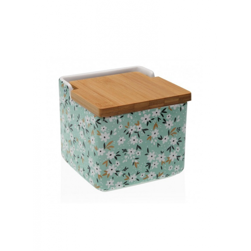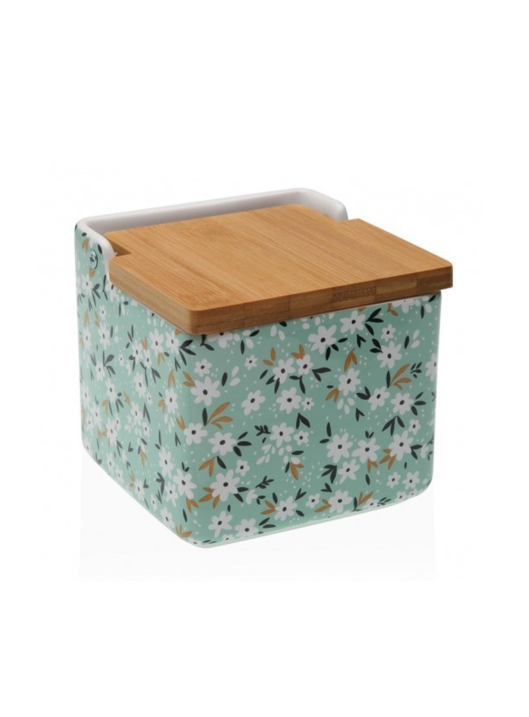 Salero combinado en madera de bambú y cerámica con estampado de flores.