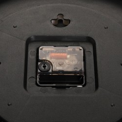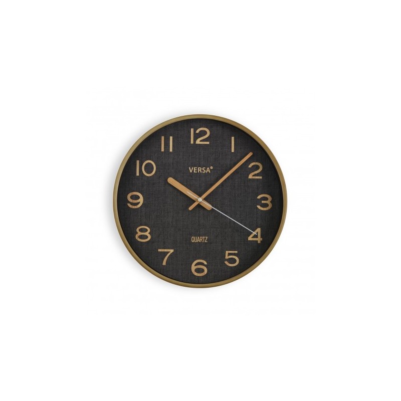 Reloj de pared analógico hecho en plástico de esfera redonda de color negro y números dorados, las manecillas también son doradas, y la esfera tiene una textura de tela, marco del reloj es de metal dorado y contiene la palabra "Quartz" impresa en la esfera debajo del logo de Versa.