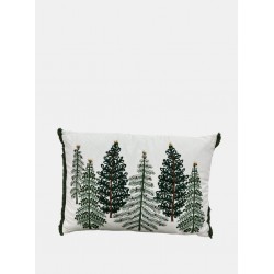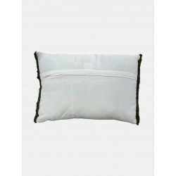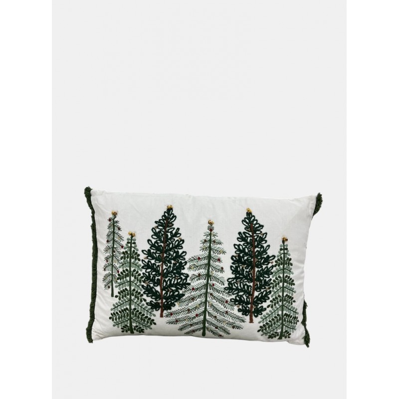 Cojin navideño de 35x50 cm. El remate de flecos verdes en los bordes refuerza el tema natural y añade un toque final de acabado. Es una pieza que evoca una sensación de bosque invernal acogedor y elegante.