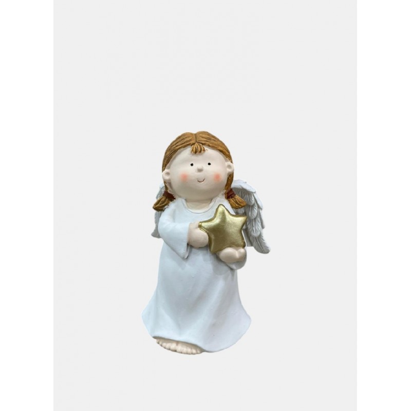 Figura decorativa de ángel. Sosteniendo una brillante estrella dorada en señal de protección y esperanza.