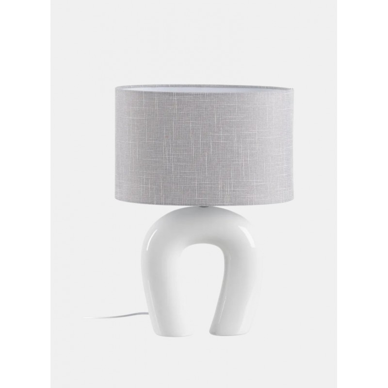 Lámpara de mesa de cerámica. Tulipa de lino. De diseño escultural que destaca por su forma audaz y contraste de colores neutros.