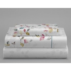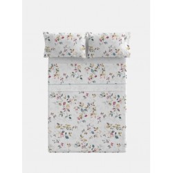 Juego de sábanas en coralina de Clara Vidal. Este modelo destaca por su diseño floral delicado y moderno. La sábana encimera y la funda de almohada presentan un estampado de flores. La sábana bajera casi lisa, complementa perfectamente el conjunto, creando una armonía de colores ideal para transformar tu dormitorio en un refugio acogedor.