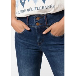 Tejano doble up para mujer de tiro alto con efecto lavado y cierre frontal de cremallera y botones metálicos.