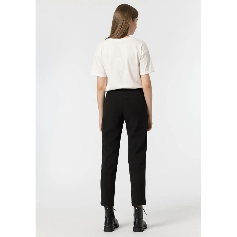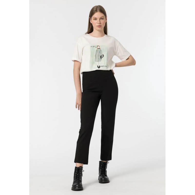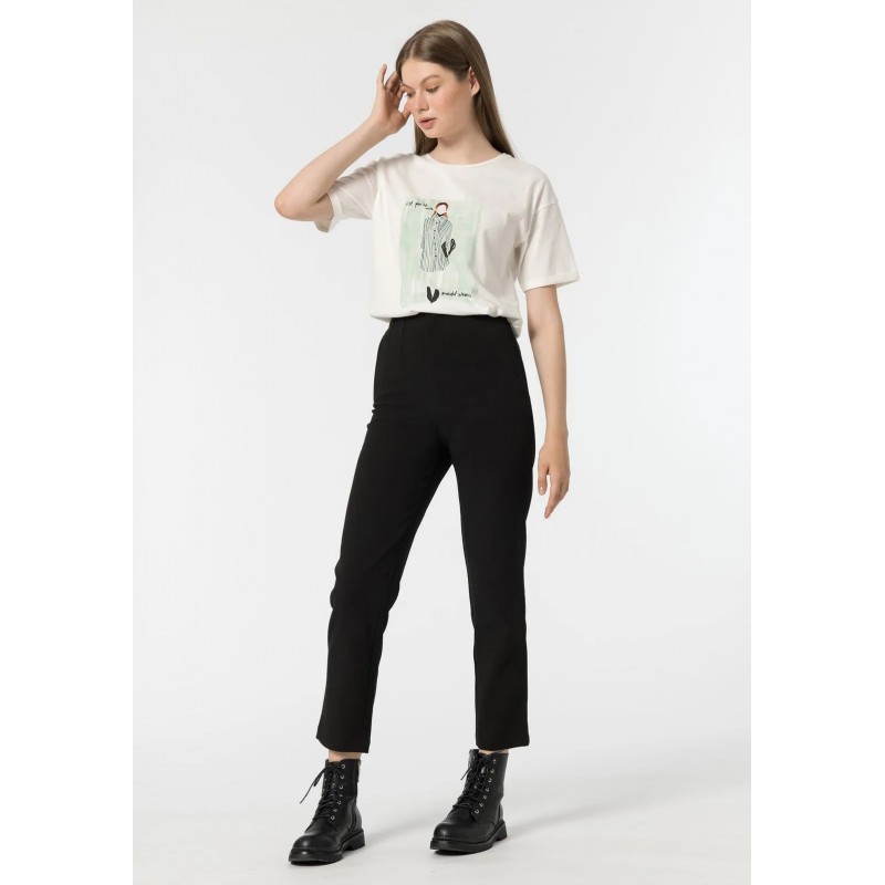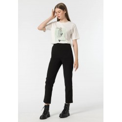 Pantalón skinny de tiro alto con bolsillos falsos laterales. Cierre frontal con cremallera, gancho y botón en el inteior.