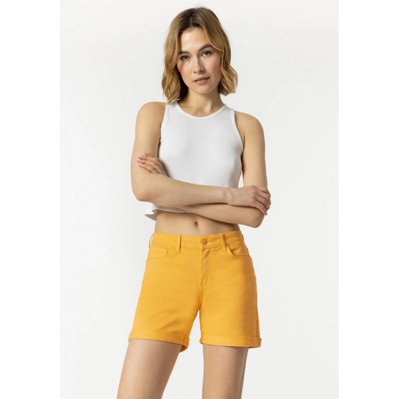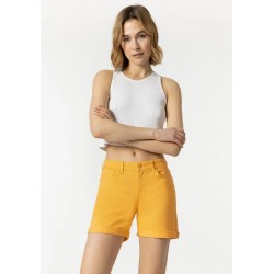Short denim de tiro alto con cinco bolsillos. Dobladillo con acabado plegado. Cierre con cremallera y botón metálico.