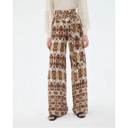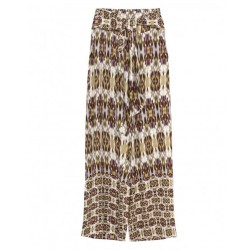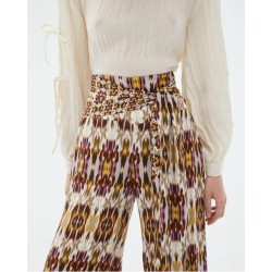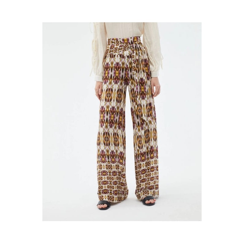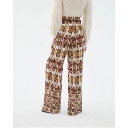 Pantalón palazzo fluido con estampado étnico multicolor. Cintura alto con cierre lateral con cremallera y detalle de cinturón ancho del mismo tejido con lazada en el delantero.