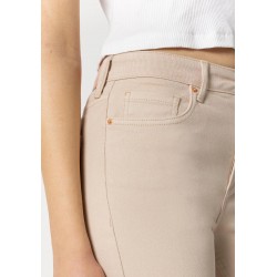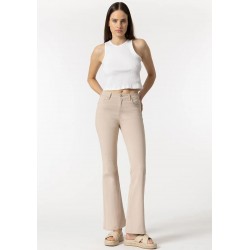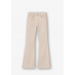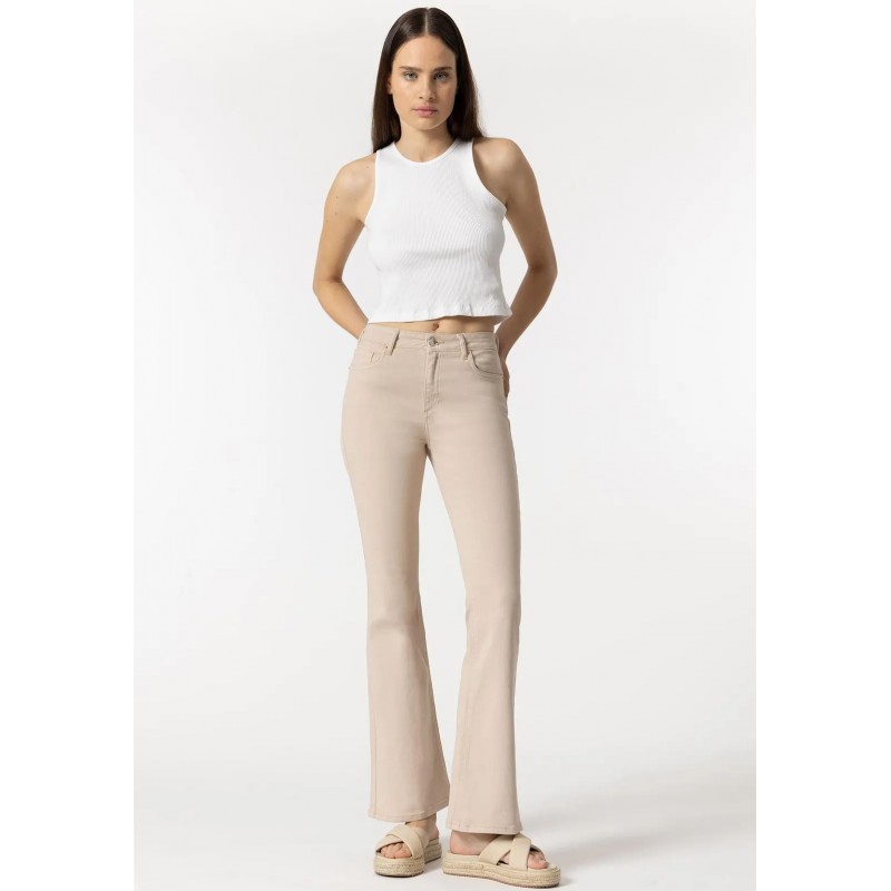 Pantalón de tiro alto con cinco bolsillos. Cierre frontal con cremamllera y botón metálico.