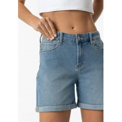 Pantalón corto denim para mujer de tiro medio con cinco bolsillos, cierre frontal con cremallera y botón elástico más bajo con dobladillo.