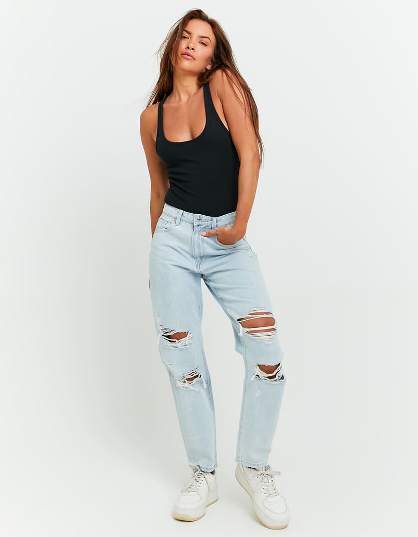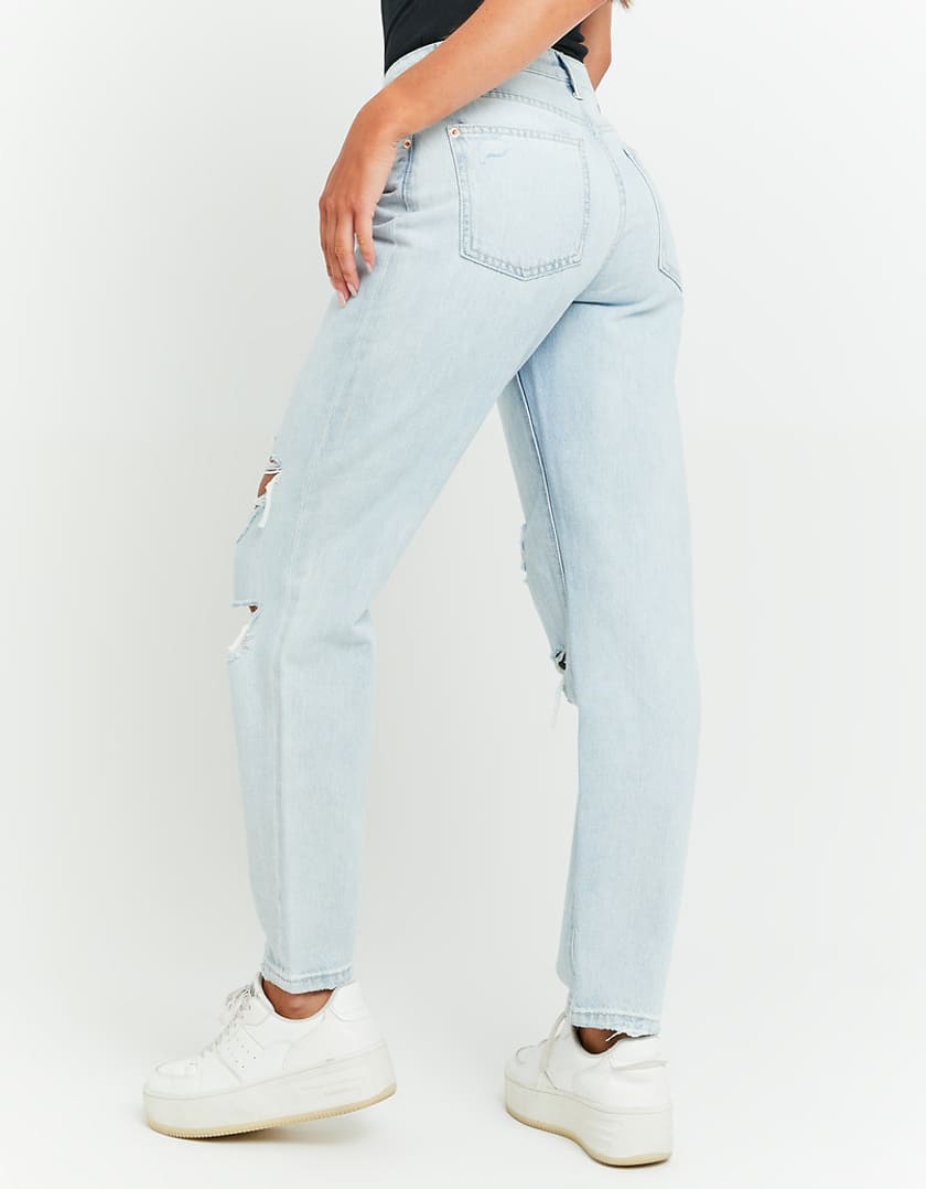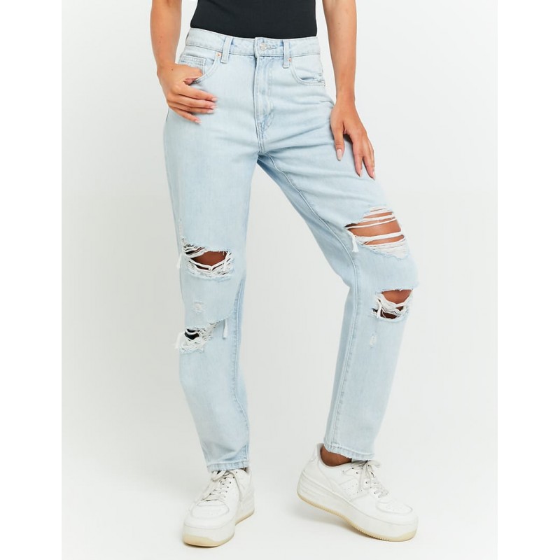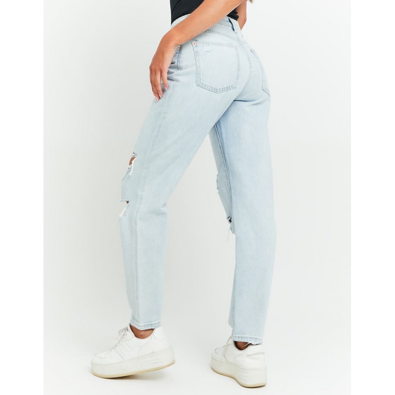 Pantalon denim para mujer.Cintura alta. Detalles de roturas. Corte recto.