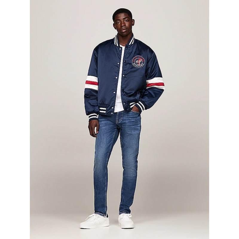 Pantalon denim para hombre. Efecto arrugas en muslos. Efecto desteñido en la parte delantera y trasera. Estilo de cinco bolsillos. Parche con el logo de Tommy Jeans en el pequeño bolsillo delantero y el bolsillo trasero. Corte ajustado.