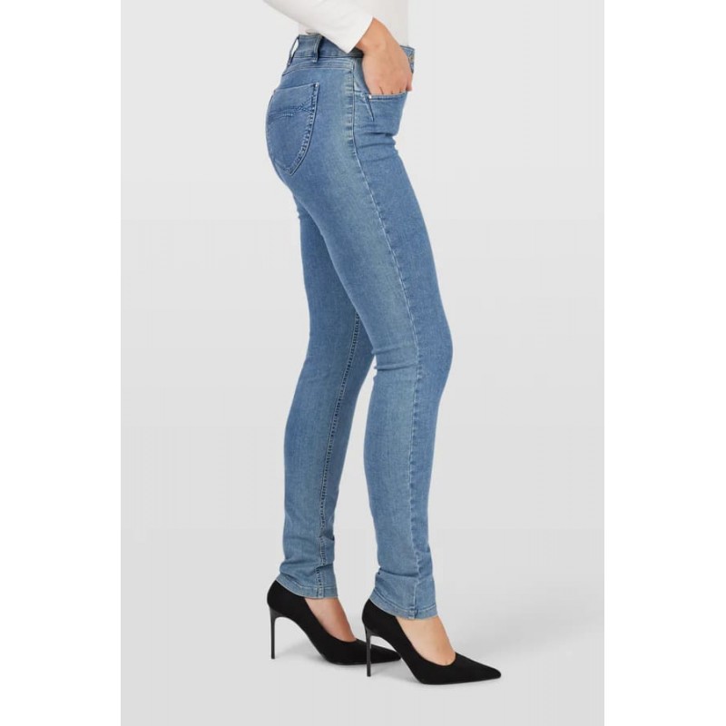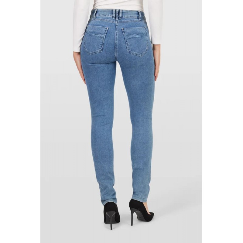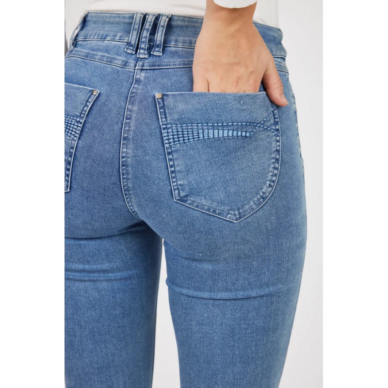 Pantalon denim para mujer.Cierre con cremallera y boton.  El modelo está diseñado con trabillas para cinturón, bolsillos delanteros y bolsillos traseros, donde un patrón de bordado decorativo adorna los bolsillos traseros. Este modelo Elena tiene un ajuste ceñido en la cintura y las caderas y un ajuste más relajado en la pantorrilla y los tobillos.