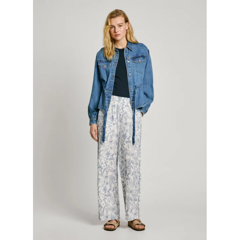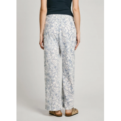 Pantalón recto en tejido fluido para mujer.Confeccionado en una mezcla de lino. Cintura elástica con detalles fruncidos. Bolsillos en costuras laterales.Estampado floral all over.Pierna ancha.